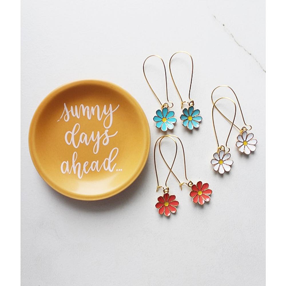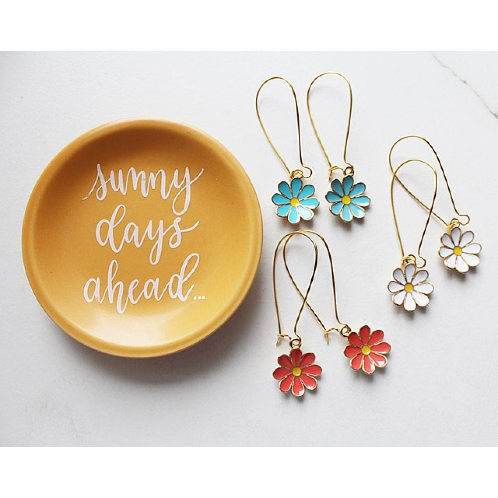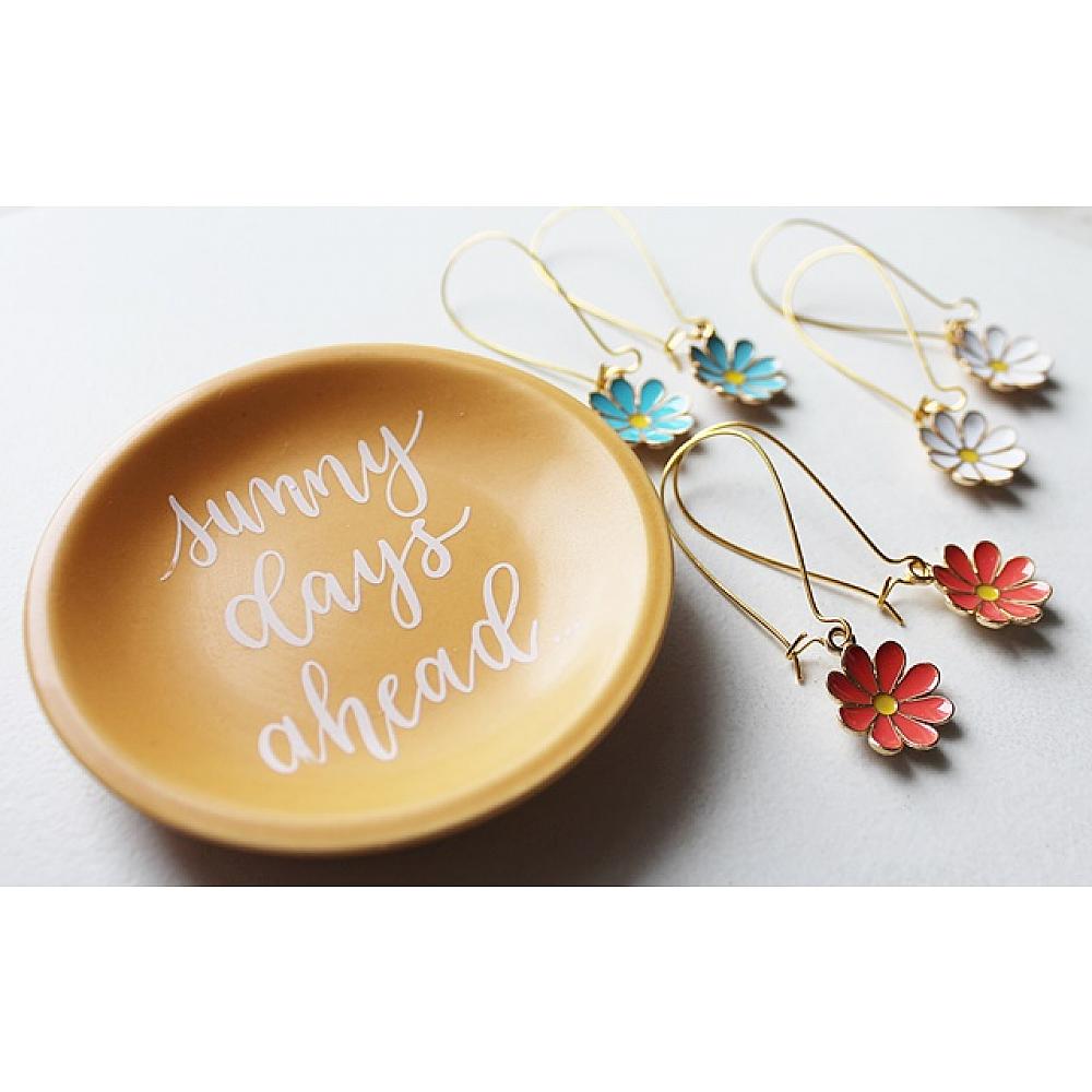 * I've wanted to add some items that are a bit more affordable without ditching the quality of my pieces. In order to do that, I had to change the metal on the earwires. While I almost always design with 14kt GF or Sterling Silver, I found a great alternative . . . Gold plate earwires that are also nickel free. I tested them out on myself as I have a severe allergy to some metals. ALL GOOD. So then, I went looking for some cute dangles that would be perfect with these kidney shaped earwires. Voila . . . it's the Daisy. Available in 4 colors. Aqua, Orange, White, and a soft Pink, not shown. I'll get one of those up on the site soon. Choose your color from the drop down menu.