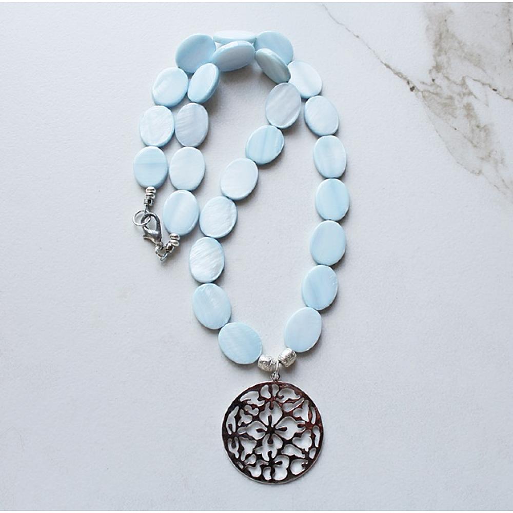 * Gorgeous, sky blue Mother of Pearl Shell beads are the anchor for this pretty filigree silver pendant. It's a simple as can be but is absolutely gorgeous. I've secured the necklace with a silver lobster clasp.