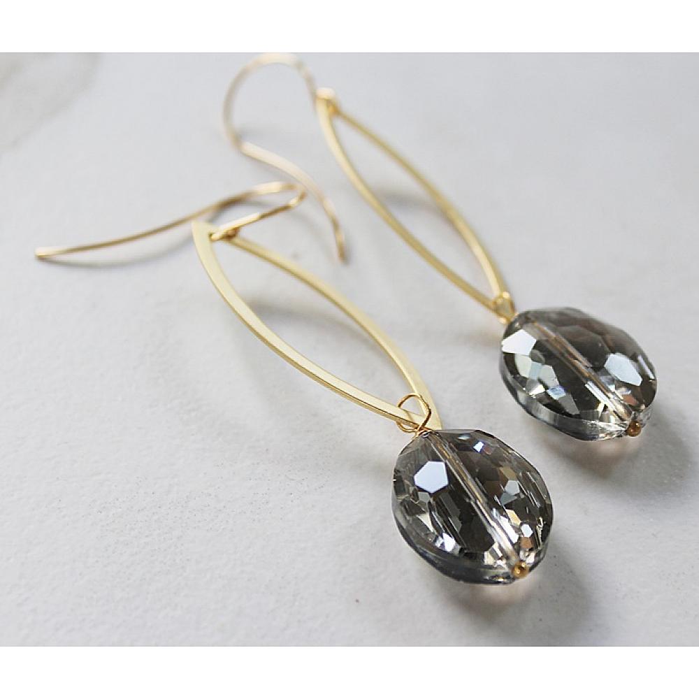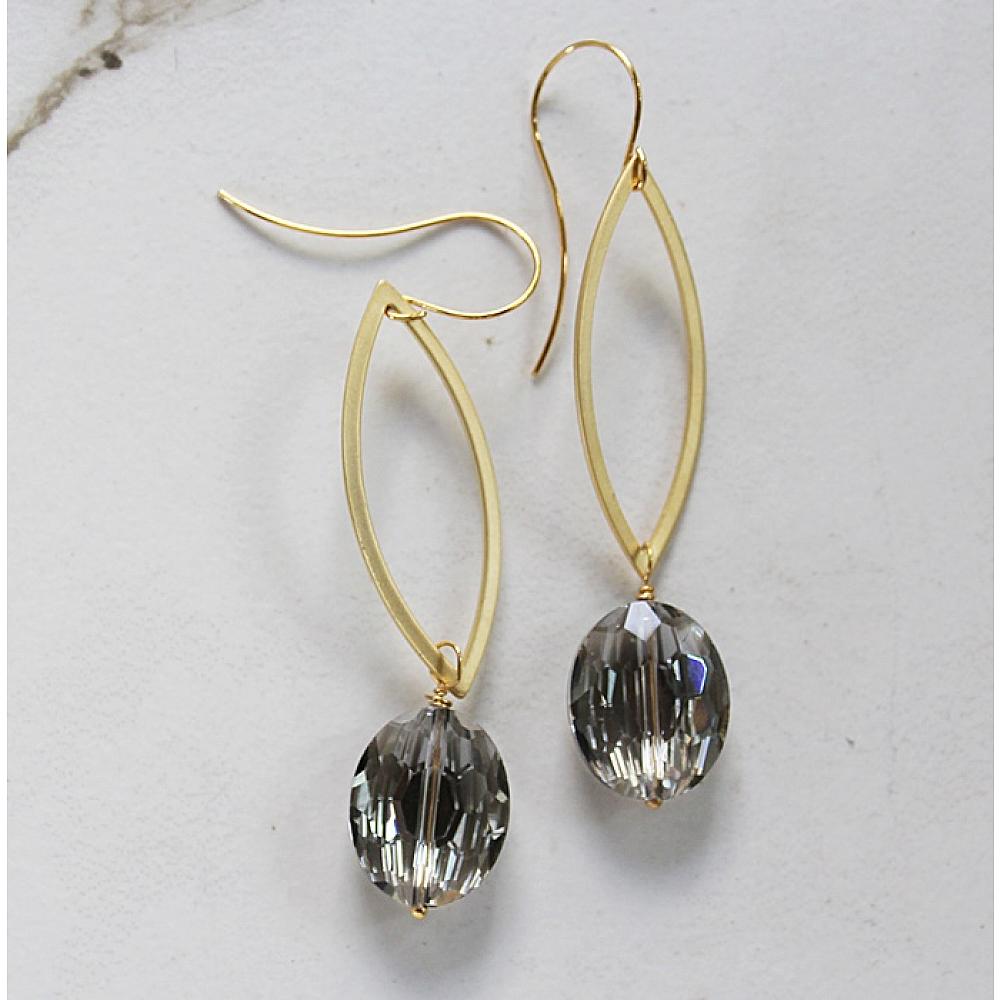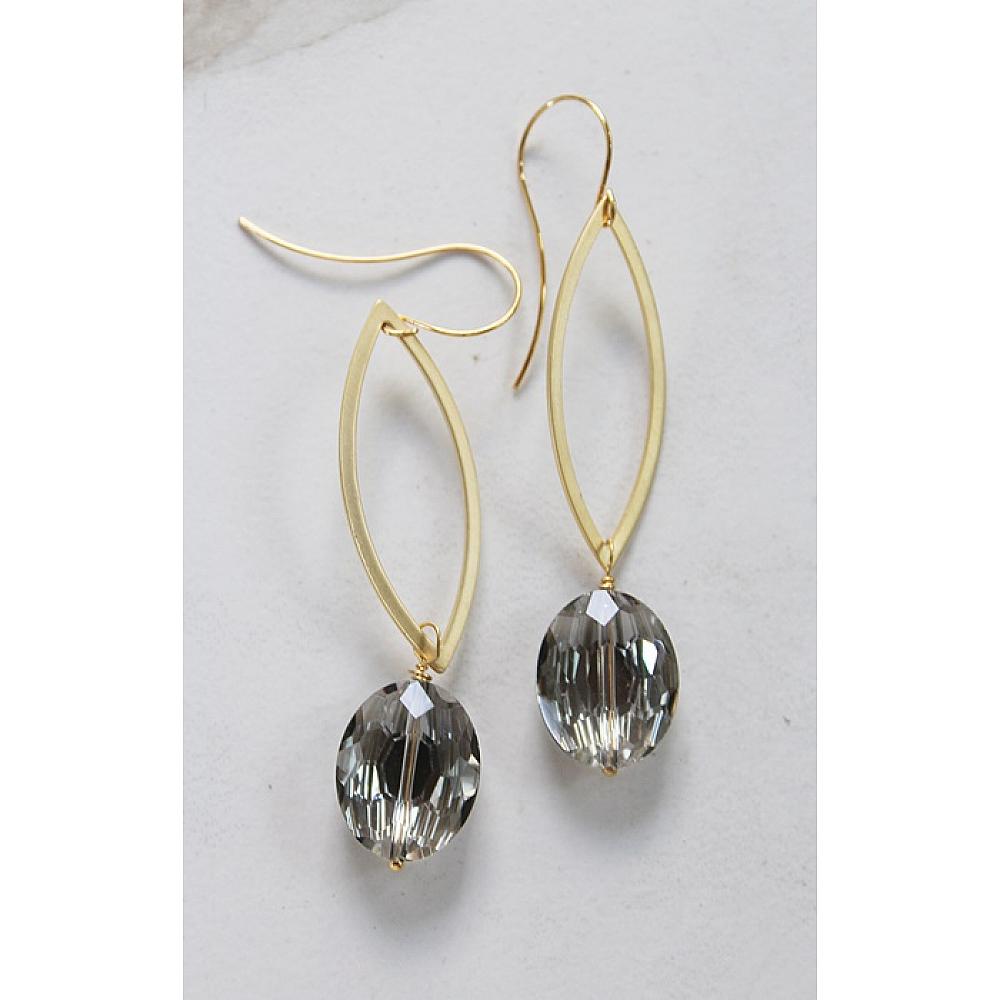 * The same gorgeous glass as on the Julia Necklace comes back on these pretty earrings. You could certainly wear these with the necklace for a mixed metal look. The earrings are hung on gold elongated hoops and dangle from gold fill earwires.