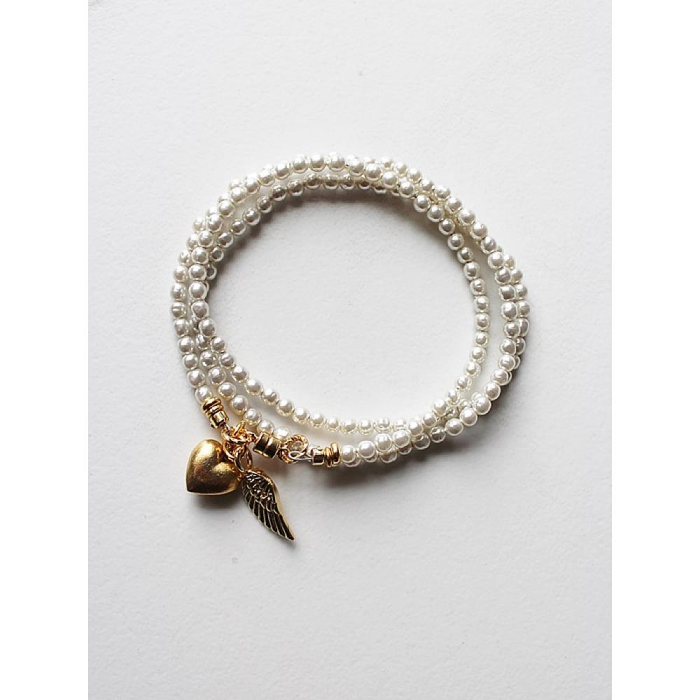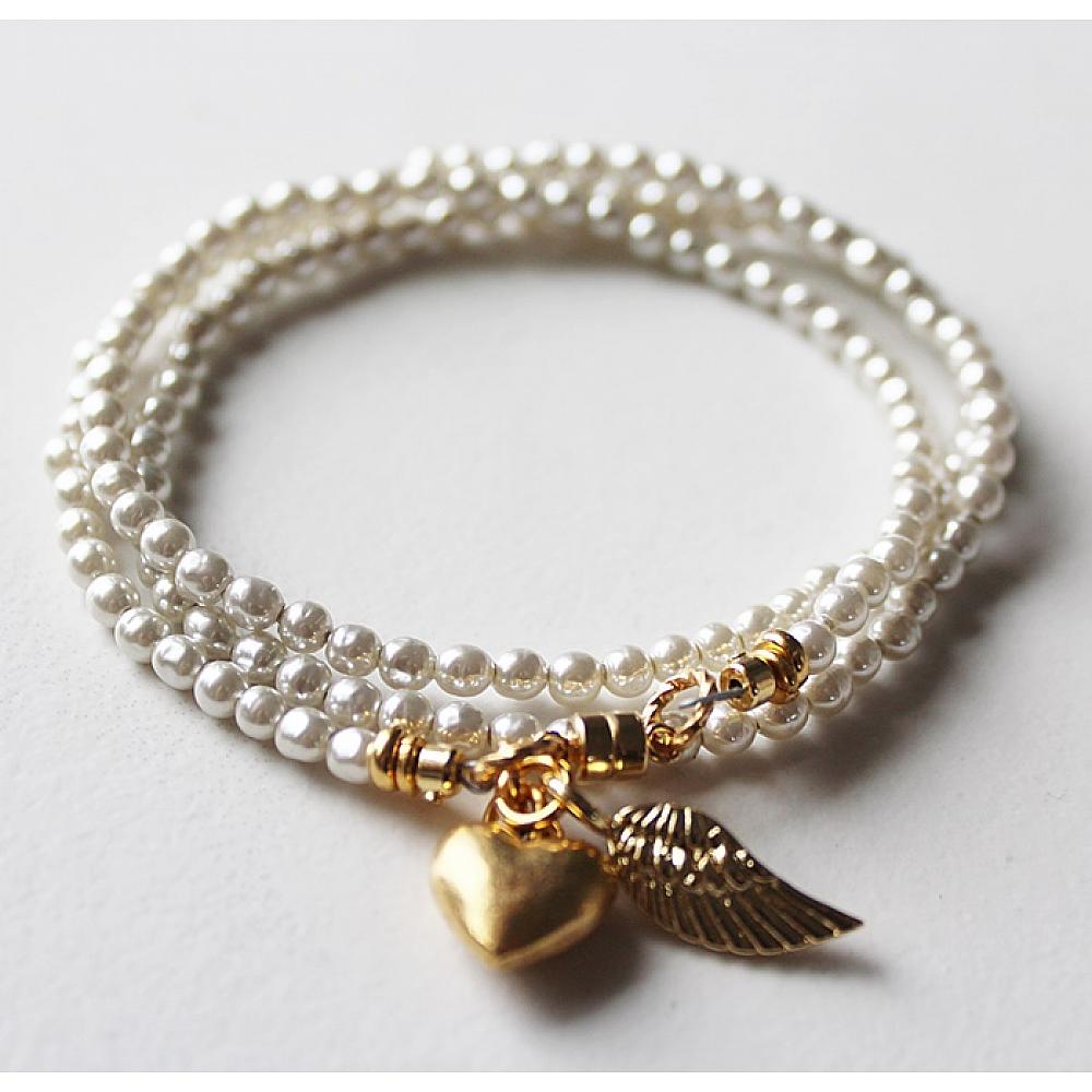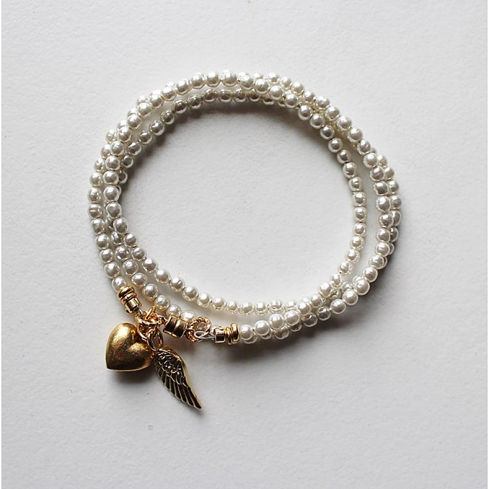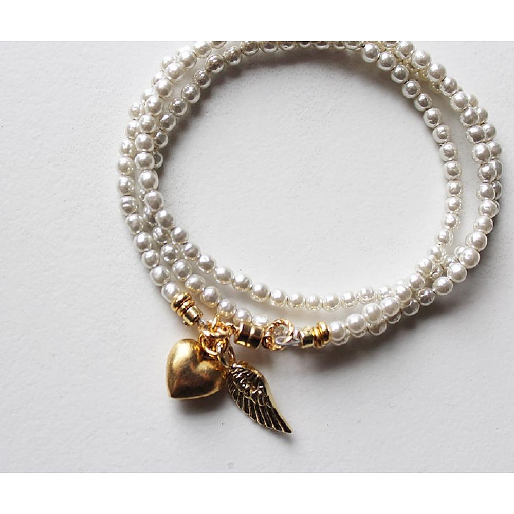 * A sweet Vintage Glass Pearl triple wrap bracelet or necklace comes together with a couple of darling charms - a wing and a heart. Here in the Pacific NW, during the winter months there are a gaggle of pure white swans who make an appearance. I love the tiny wing on this and the pure white glass pearls. Add a heart and give it to someone special. The bracelet is secured with a gold magnet clasp.