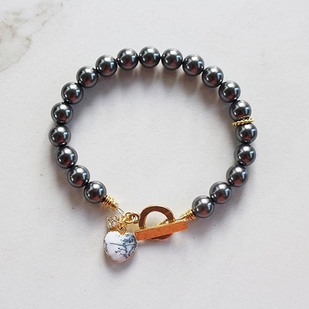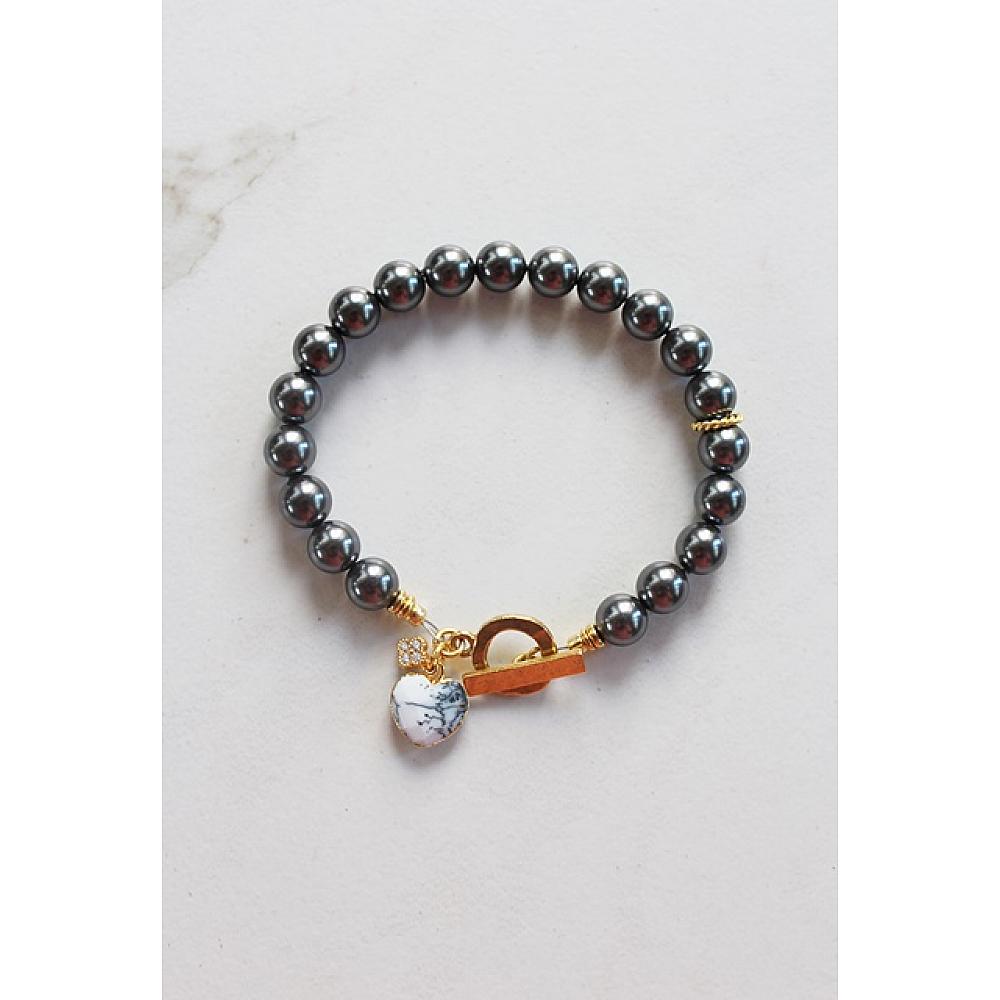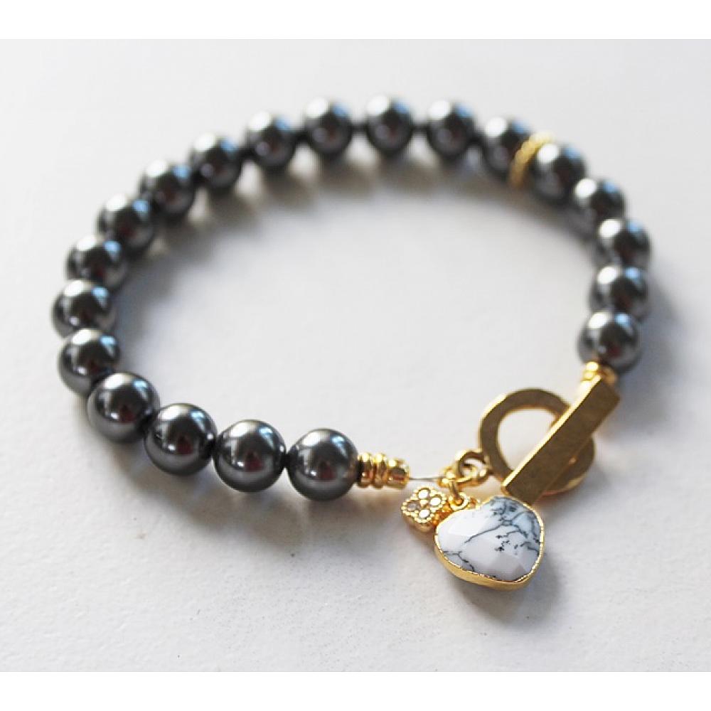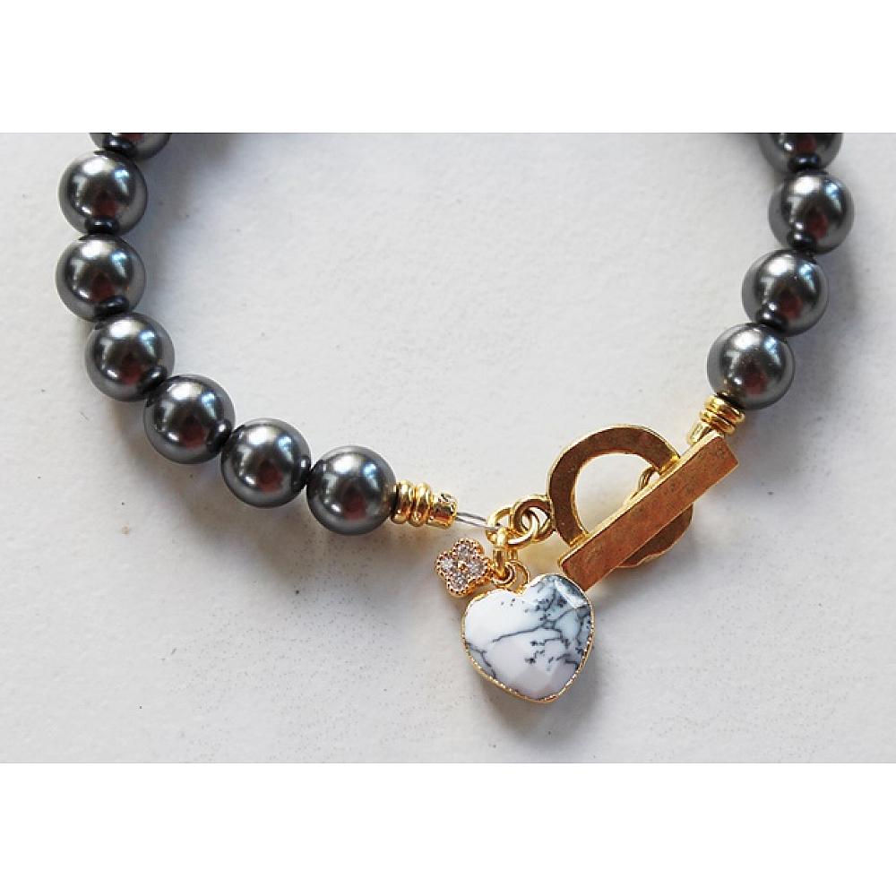 * If you're not a red girl, this neutral and sweet gray pearl bracelet is for you. Strung on heavy duty wire, these gray pearls are so luminious. The Dendritic Opal heart charm is adorable, shades of white, gray, blue, black. The bracelet is secured with a gold tone toggle set closure.