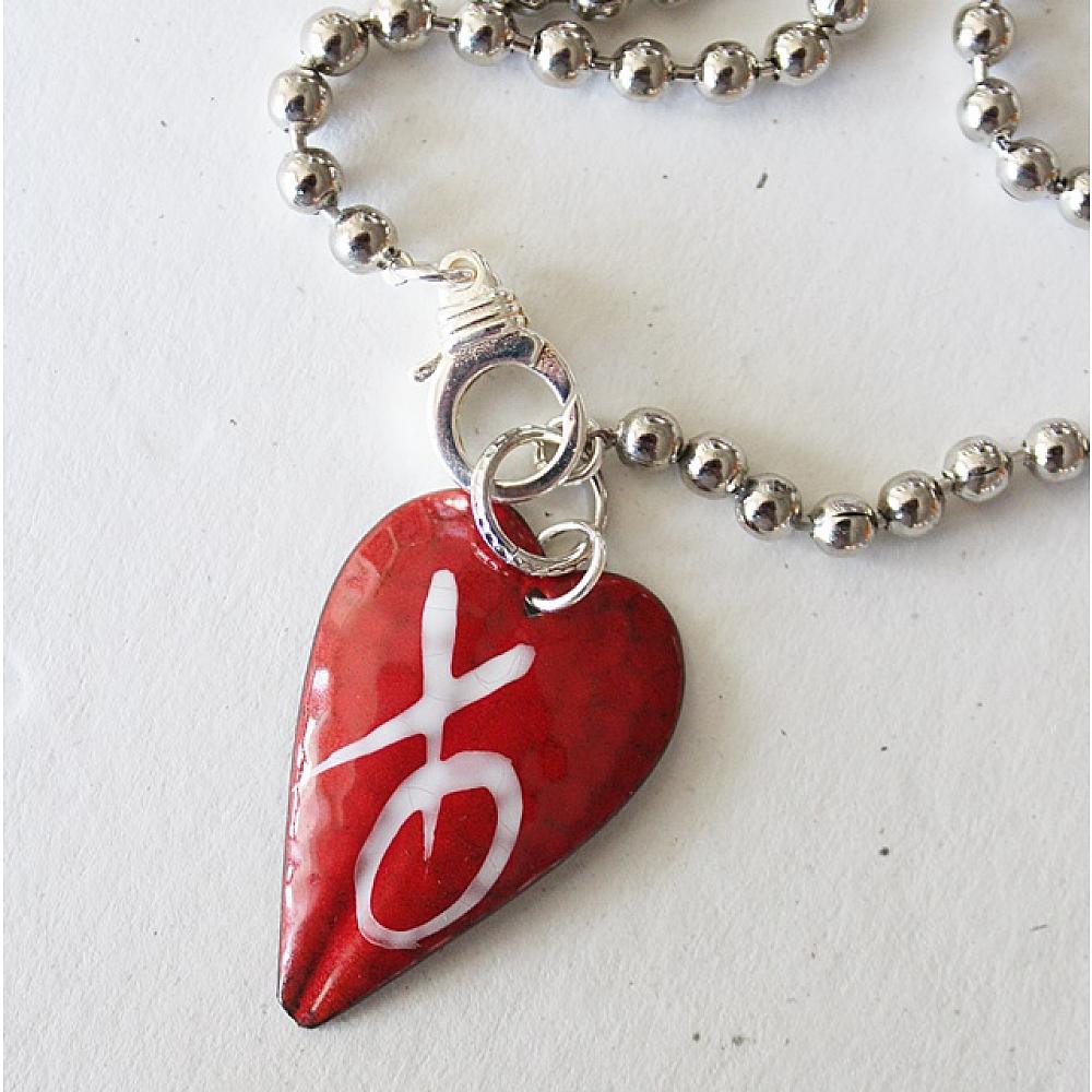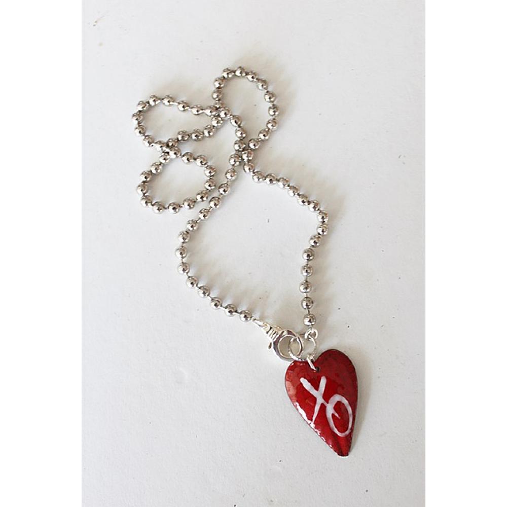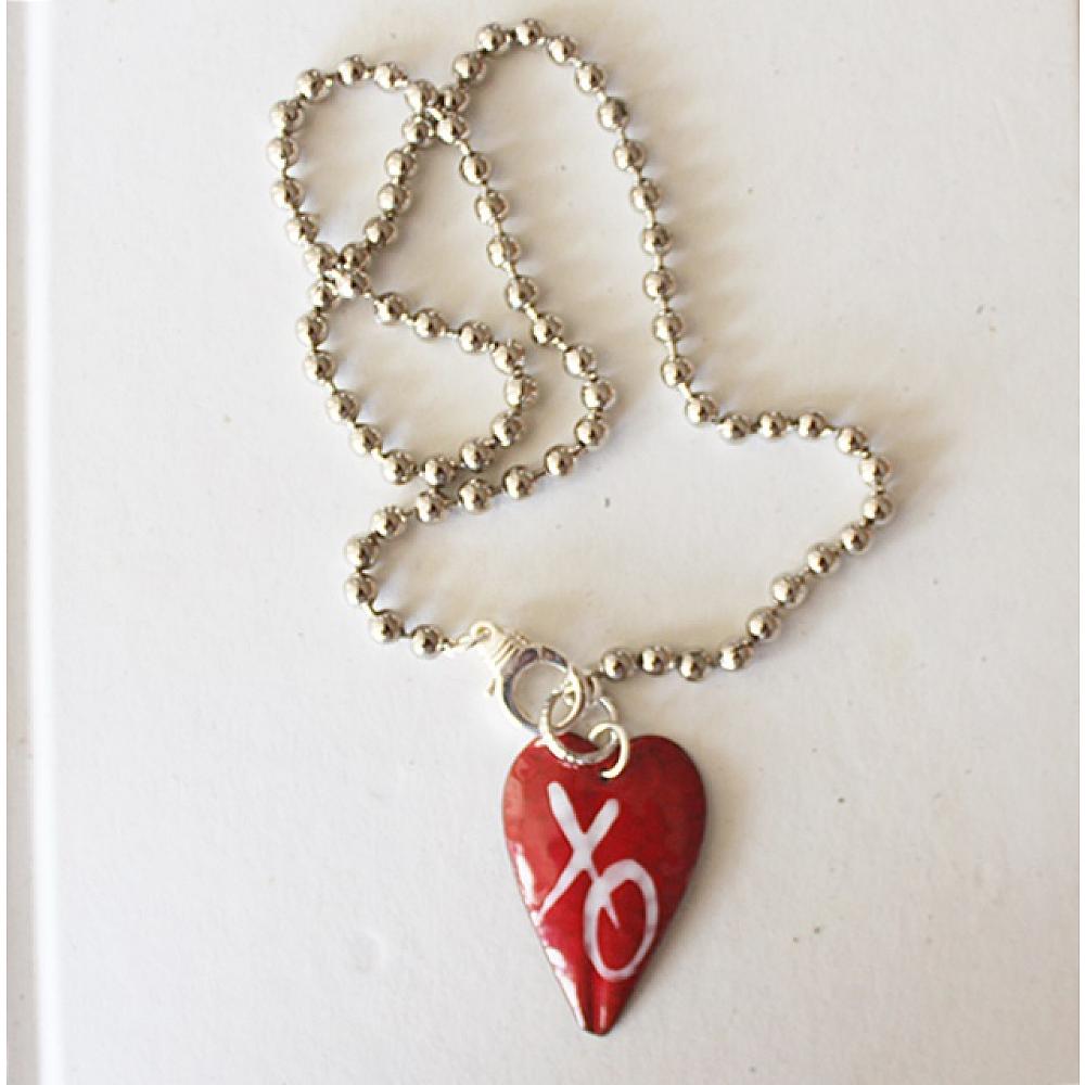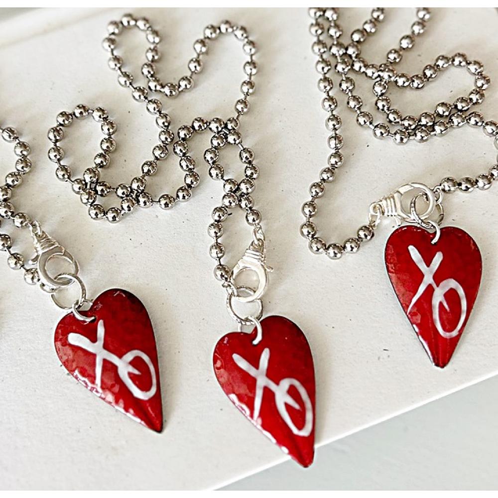 * I can't even tell you how sweet these handmade enamel XO heart necklaces are. They are the perfect Valentine's Day gift for you or someone you love. I've kept them simple - a silver ball chain, a sterling clad clasp. Super simple. The pendant dangles from the chain in front. Easy on and off.