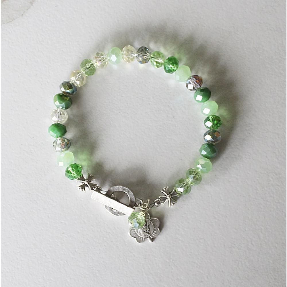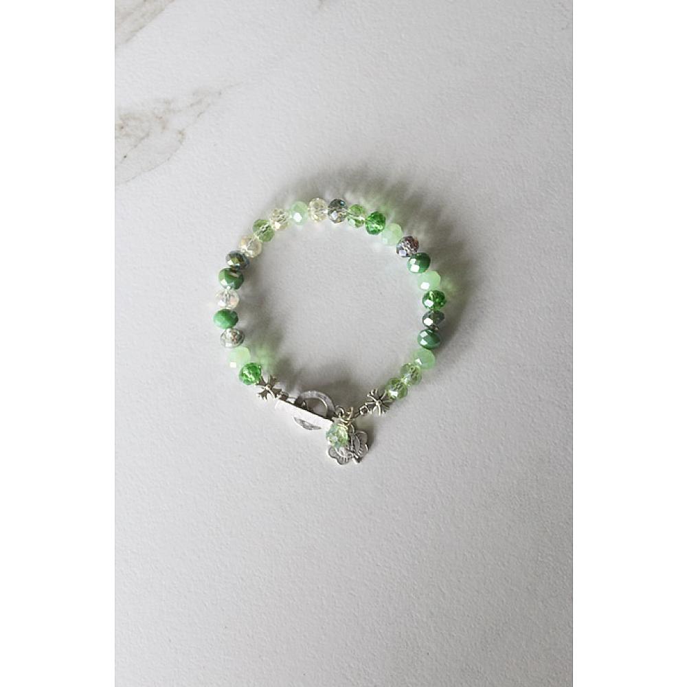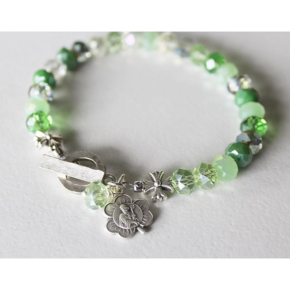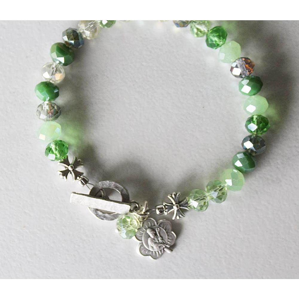 * Well, this one is kinda near and dear to my heart for many reasons. First, I'm an Irish Lass (but you already knew that). Secondly, it's one of my favorite holidays, and lastly, the beautiful shamrock charms were purchased when we visited Ireland back in '23. I forgot I had them. They are so sweet, and if I can say, the local Priest blessed them for me. The bracelet is Czech glass in an assortment of greens and is secured with a simple toggle set in silver.
