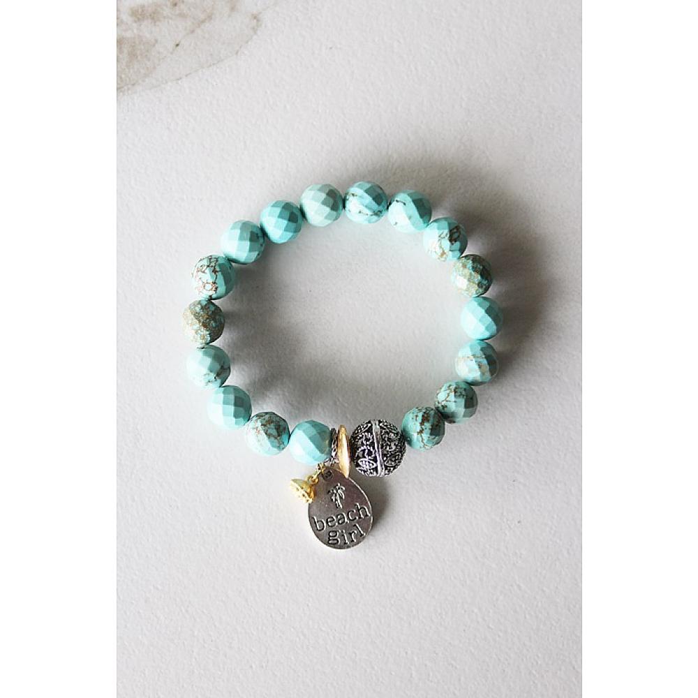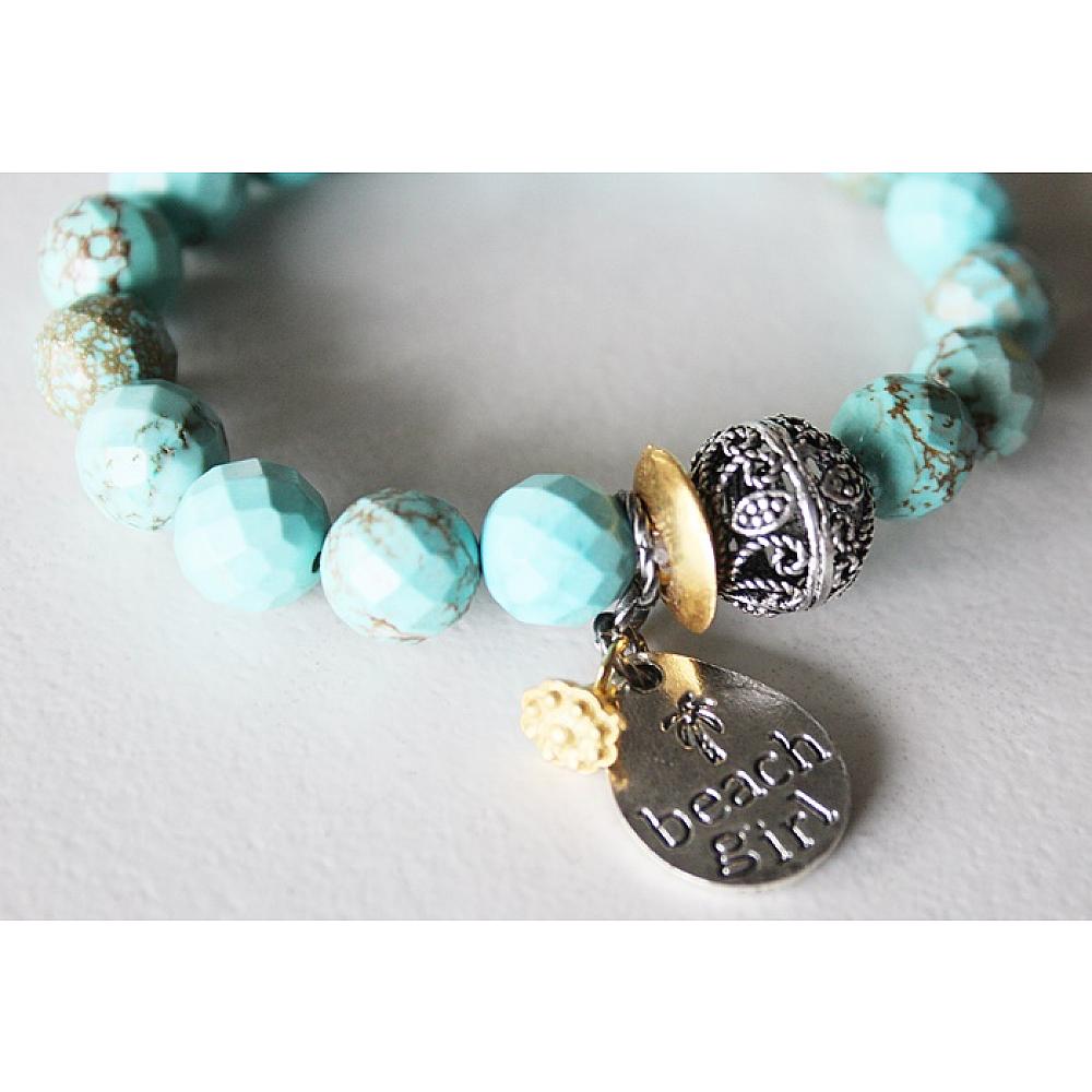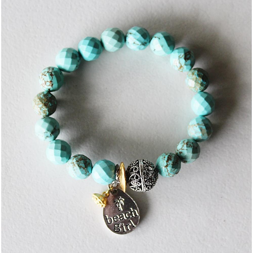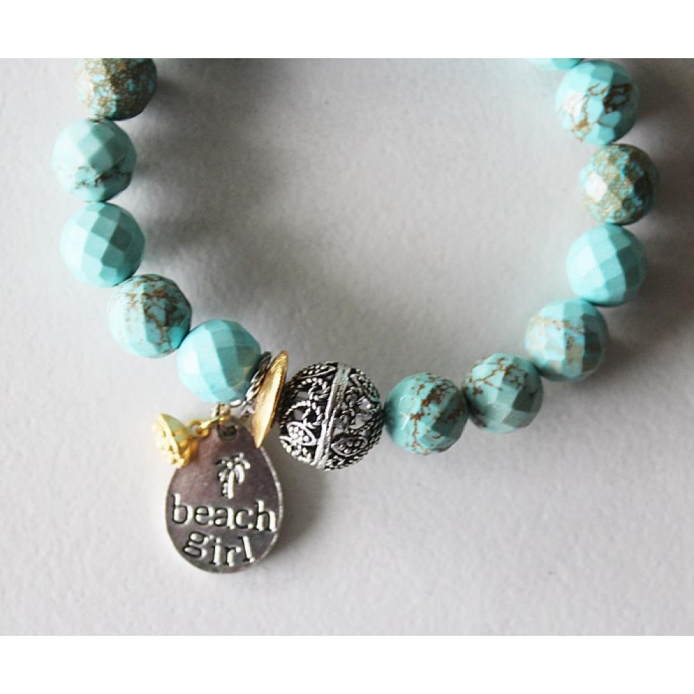 * I love this darling stretch. It's the perfect transitional bracelet - head into Spring on a quick trip to the beach, and then spend the summer soaking up the sun. I've added a handful of faceted turquoise magnesite and stung them on heavy duty elastic. A fun filigree focal bead and a darling beach girl charm dangle from the bracelet. It's perfection.