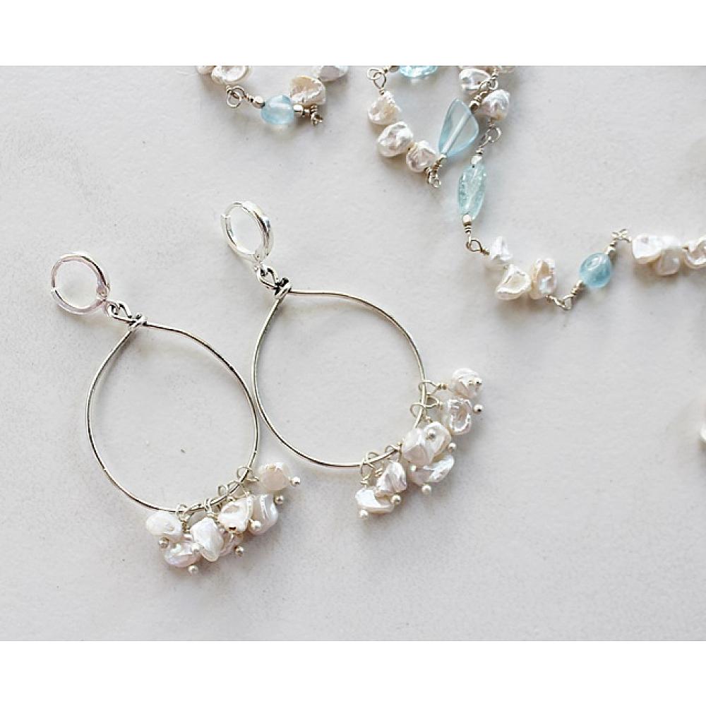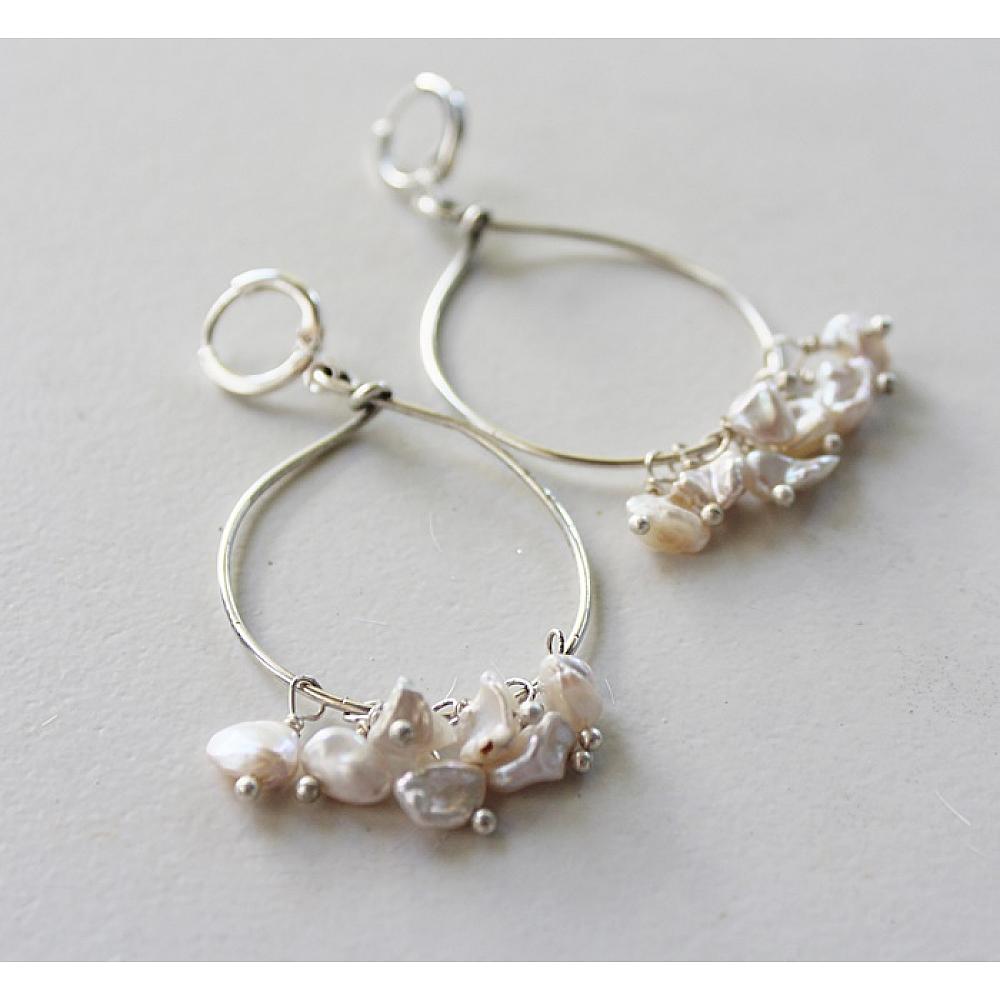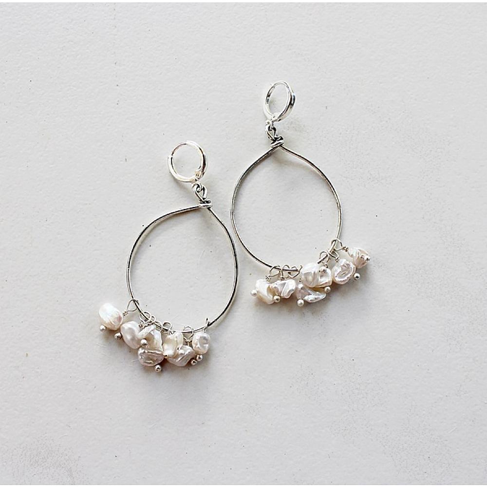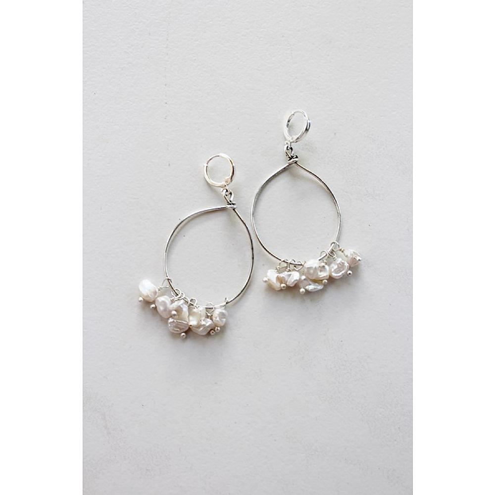 * Individual, handwired Keishi fresh water pearls cascade from hoops of Sterling Silver plate. These sweet, and dangly earrings pair perfectly with the Skye Necklace and are the perfect go-to earrings. The earrings are hung on sterling silver leverback earwires.