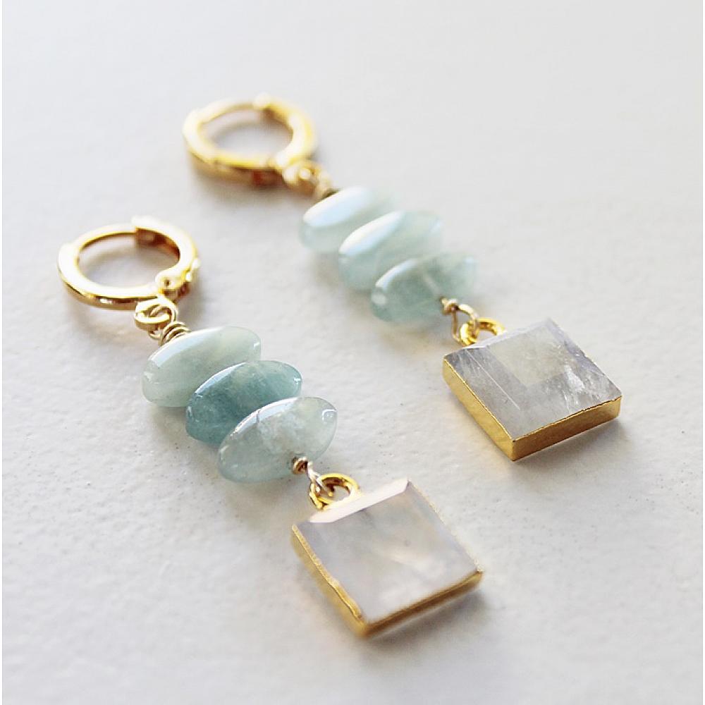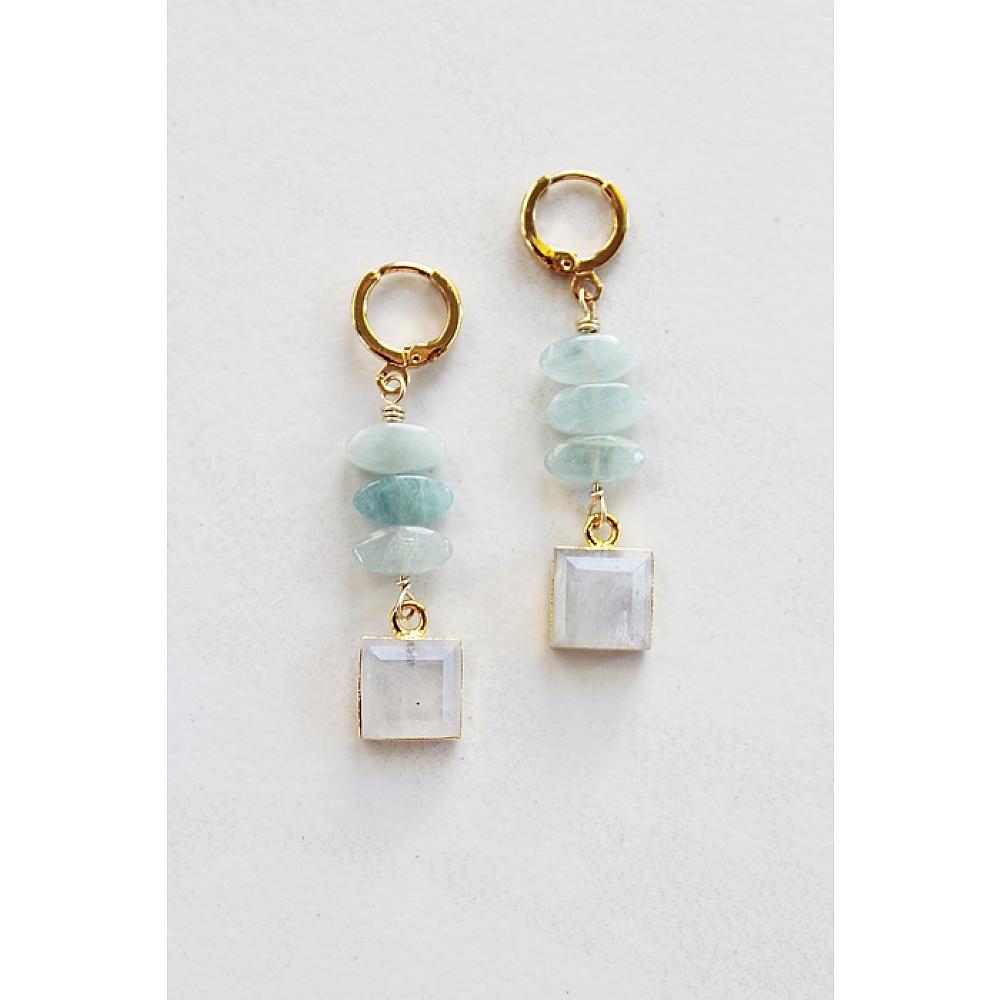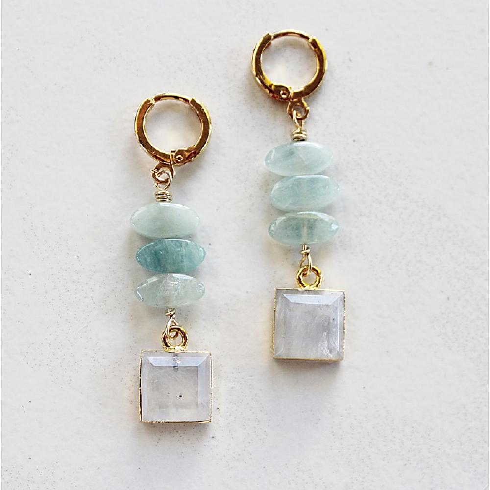 * Pair a trio of Aquamarine with a lovely, faceted square Moonstone pendant, and you have a pair of the most delightful earrings ever. These are so sweet. They are hung on 14kt gold fill leverback earwires. The color combo reminds me of a seaside beach. So lovely.