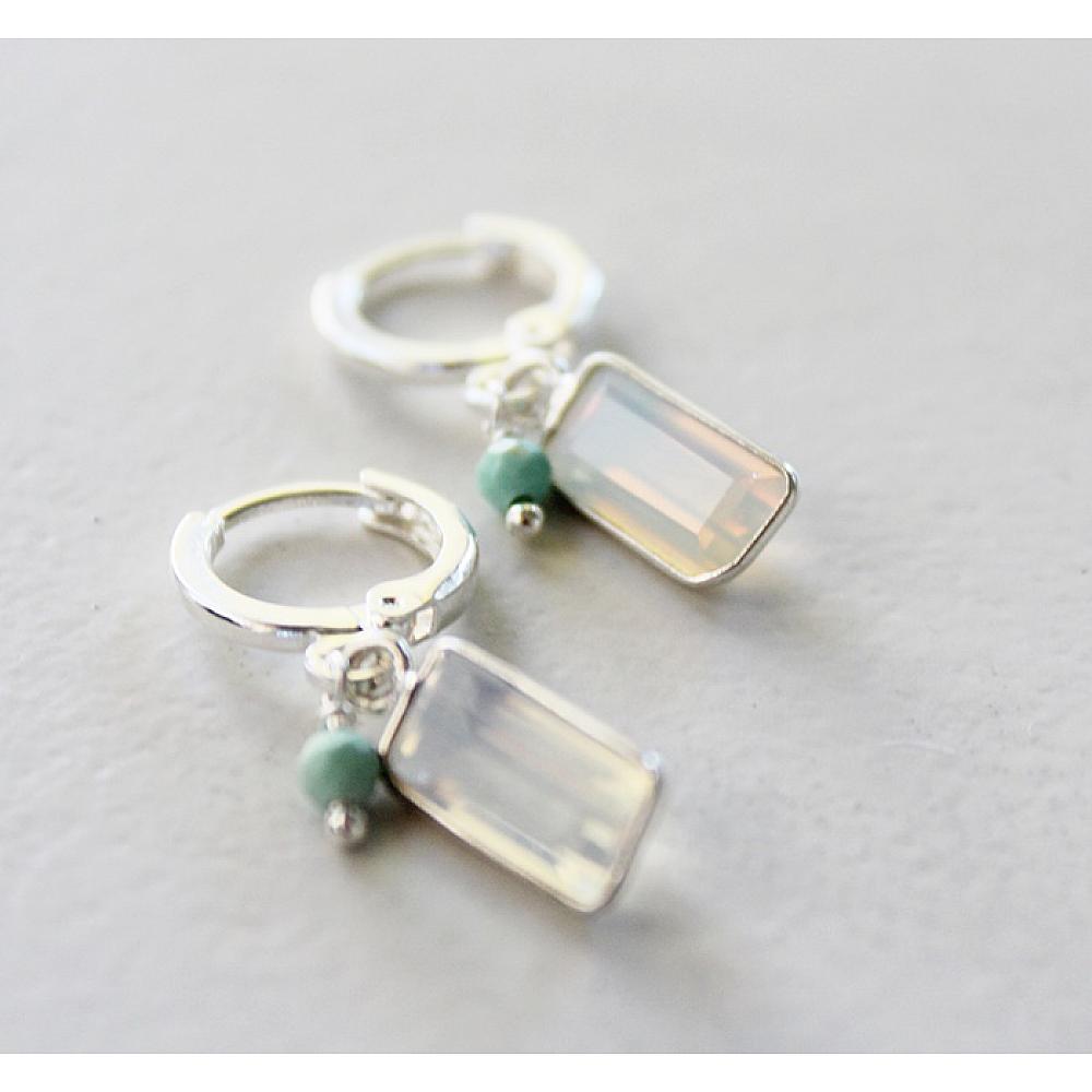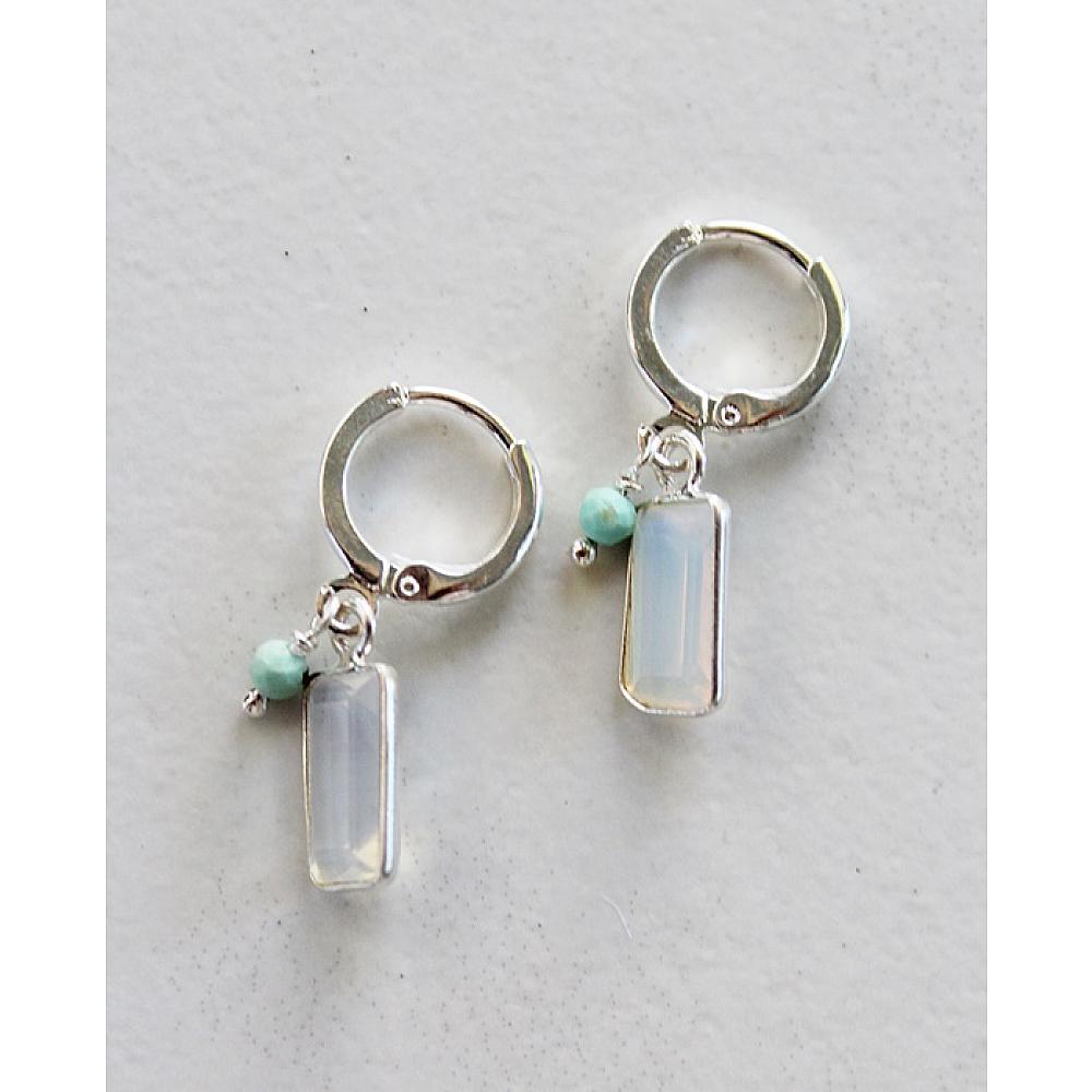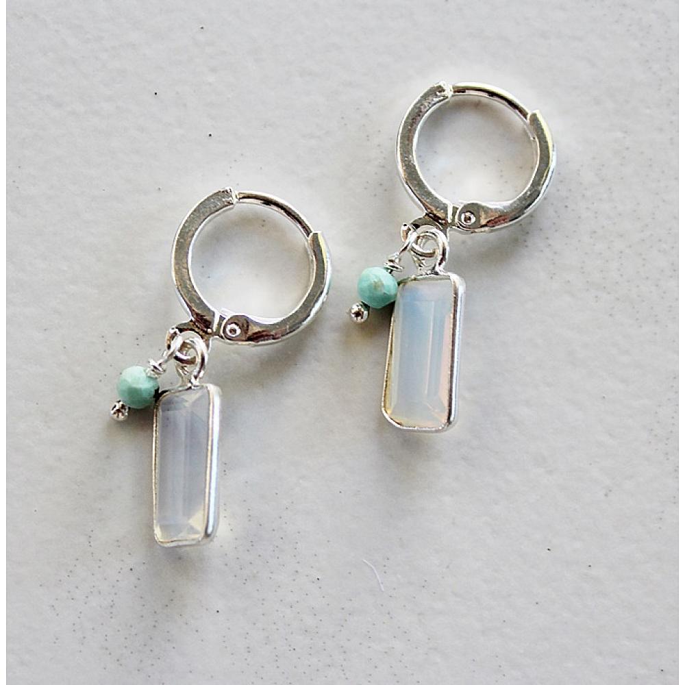 * These darling little baubles are perfect for someone who doesn't want A LOT of earring. They'd even be perfect for a young lady. Opalite rectangle pendants are hung on sterling silver leverback earwires and a tiny turquoise bead is attached to that. Simple and perfect.