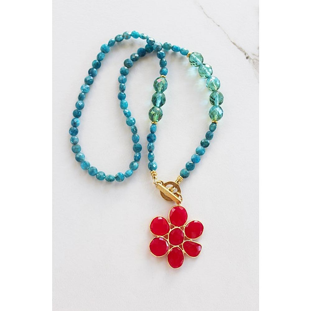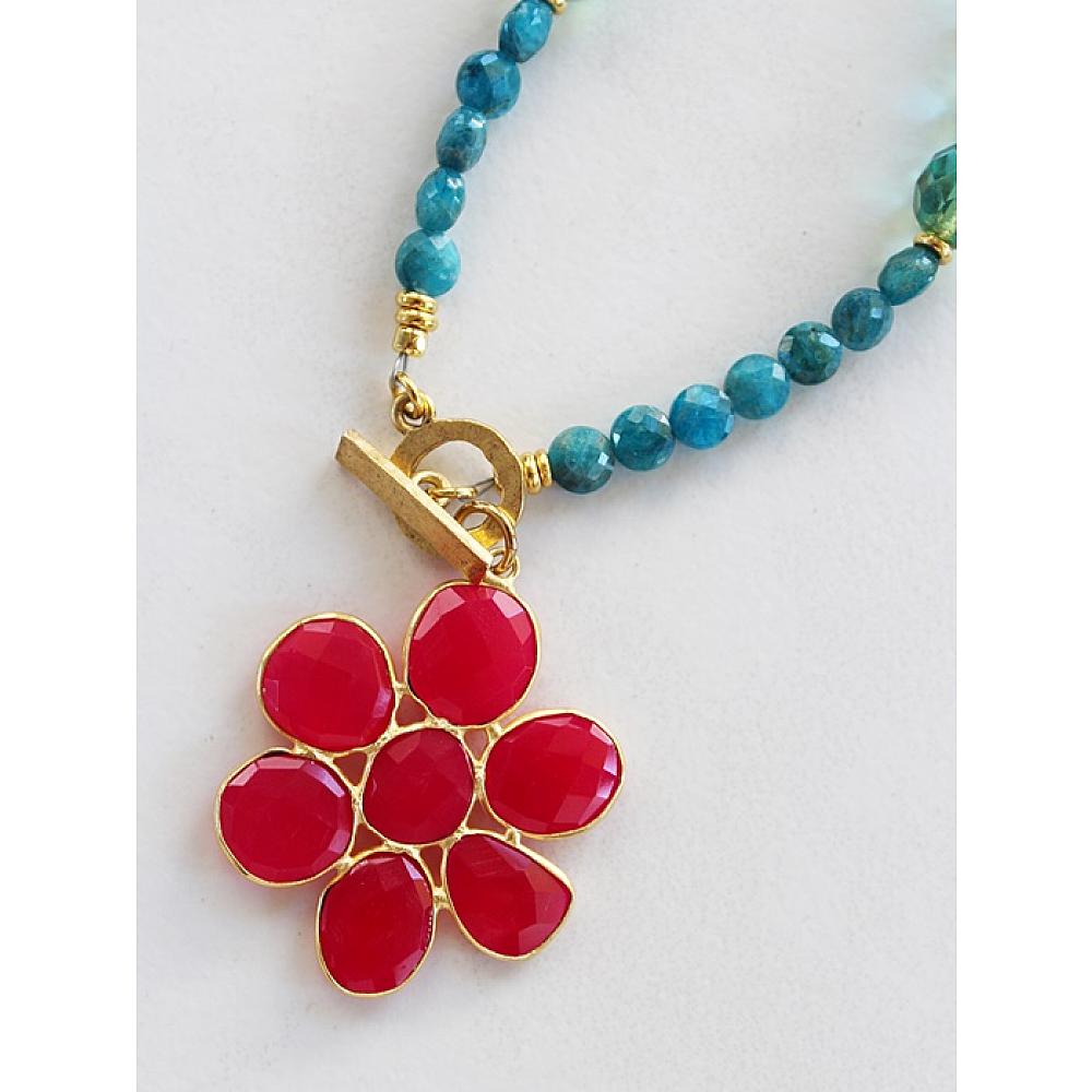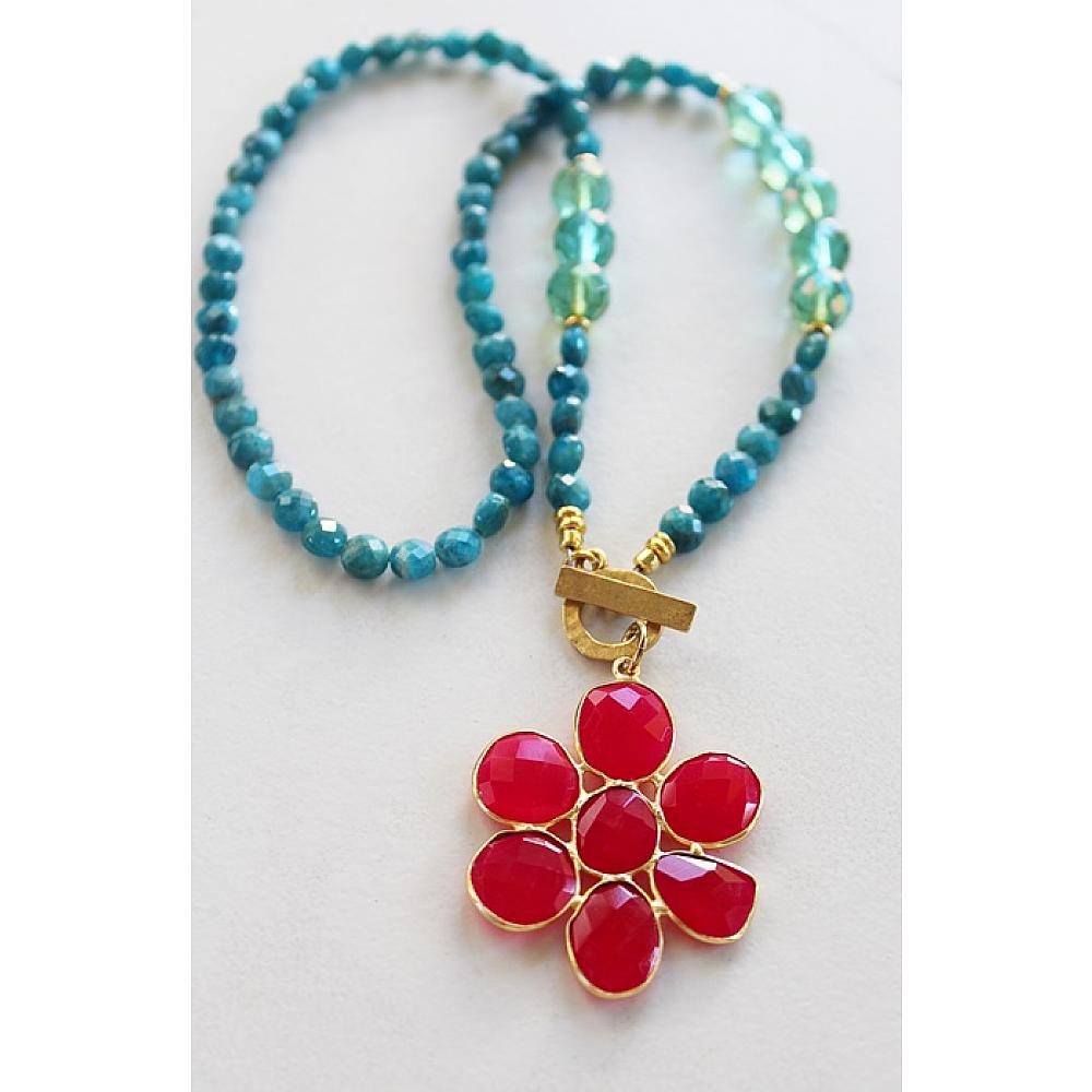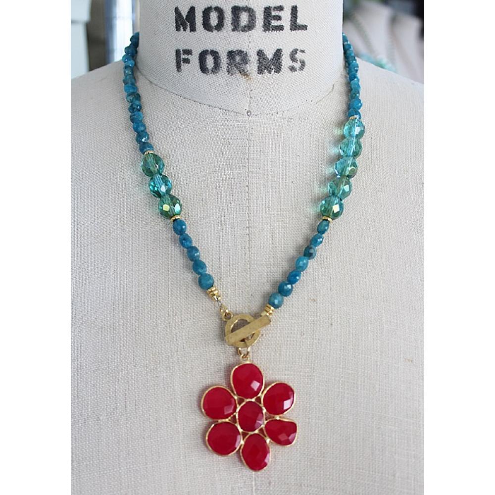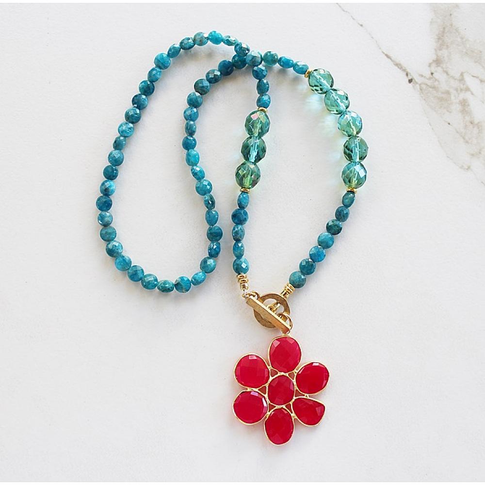 * Okay, this one is FUN! A bright and sunny statement necklace for Summer. Gorgeous, coin shaped, faceted Apatite come together along with a handful of Czech glass as a sweet and happy anchor for this fun Pink Quartz flower pendant. Can you see this with white linen? Oh, I can. The necklace is secured with a gold tone toggle set. The front closure assures easy on and off.