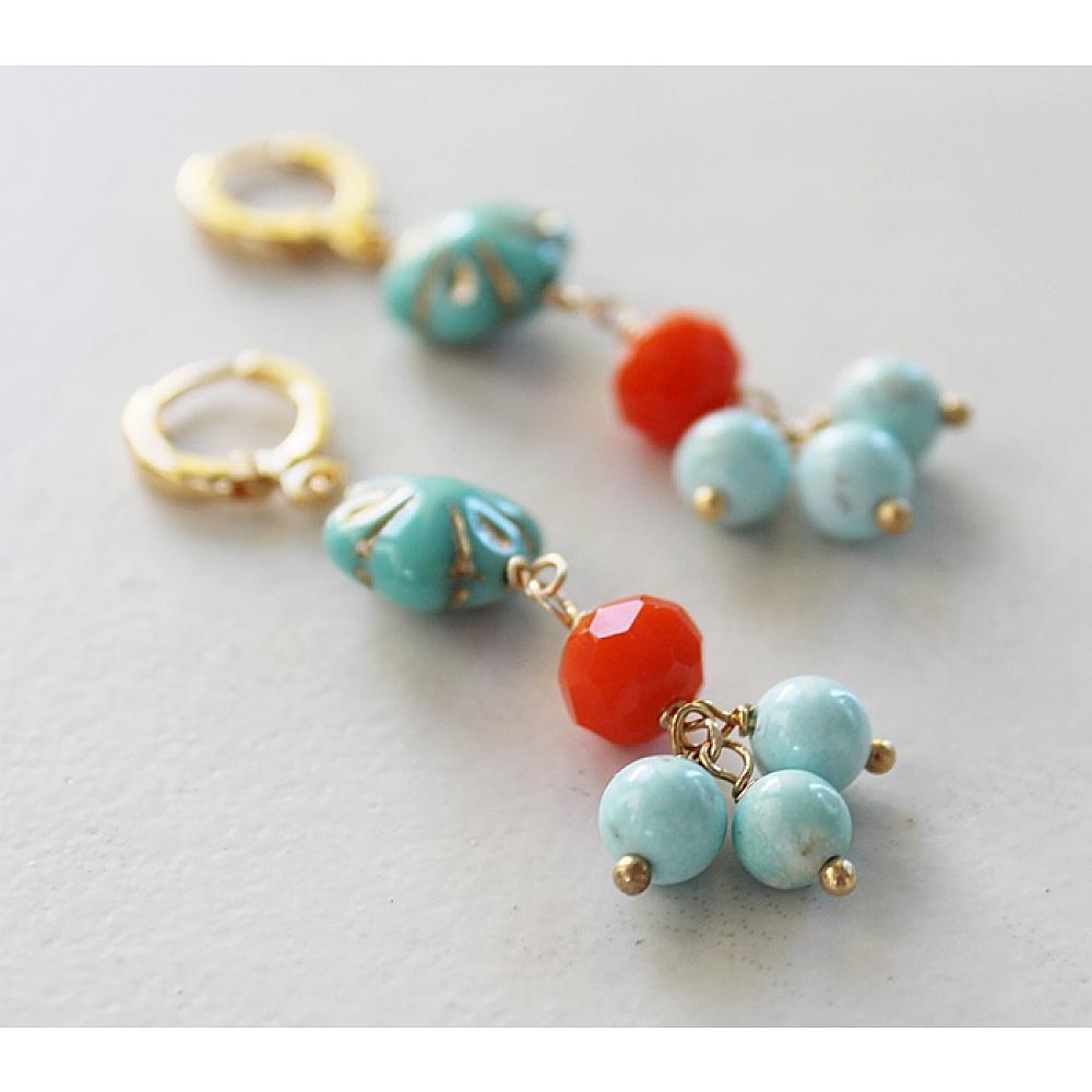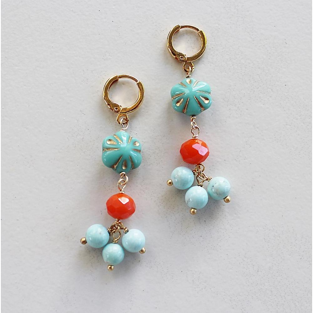 * How cute are these? I have SO MANY Czech glass that you'll be seeing variations of these earrings all Summer long. On this pair, I've started with an aqua Czech glass flower, the middle an orange Czech Glass rondelle, and the bottom is a trio of matte Aquamarine beads. I've hung these on sterling silver leverback earwires.