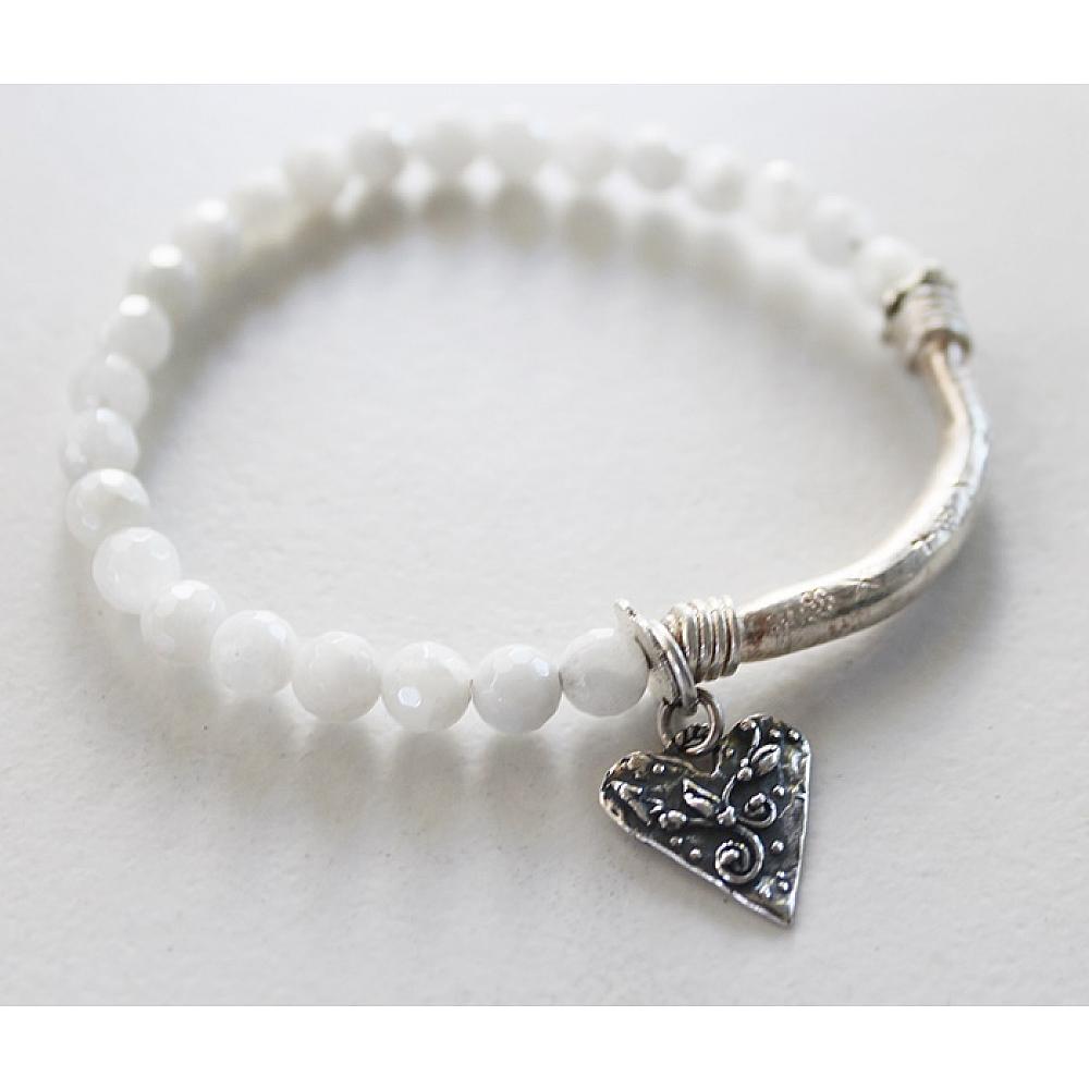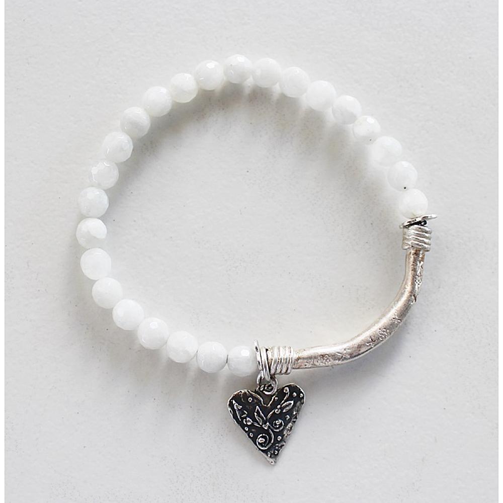* A length of gorgeous, faceted Moonstones pair up with a fun sterling silver curved bar on this lovely stretch bracelet. I've added a couple of decorative daisy spacers and a sweet silver heart. The perfect gift.