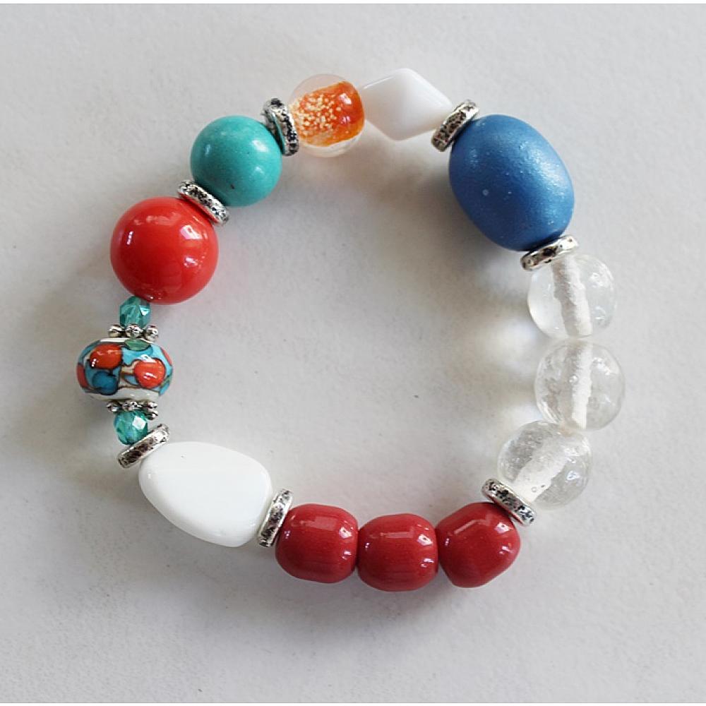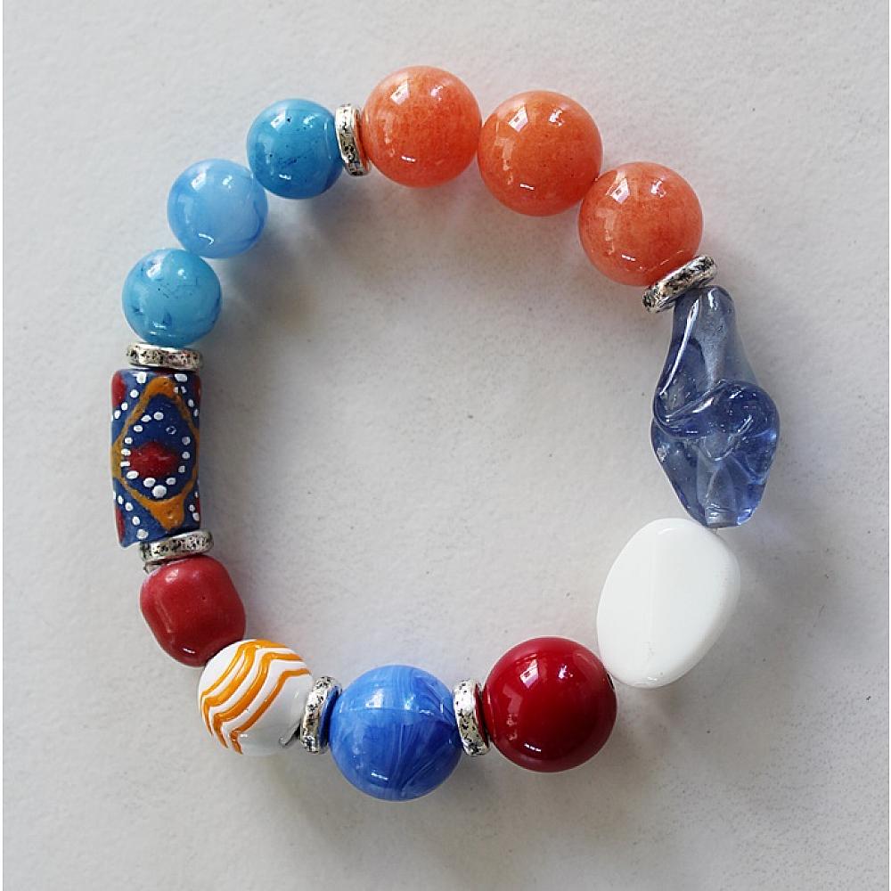 * Nothing like a bit of RED, WHITE, AND BLUE. and a bit of orange. One comes with a special hand made glass bead and a handful of fun glass, vintage lucite, and silver. The other comes with an African Fair Trade glass tube bead and various glass. I've strung these on heavy duty elastic - just roll them onto your wrist to keep their shape and stretch.
