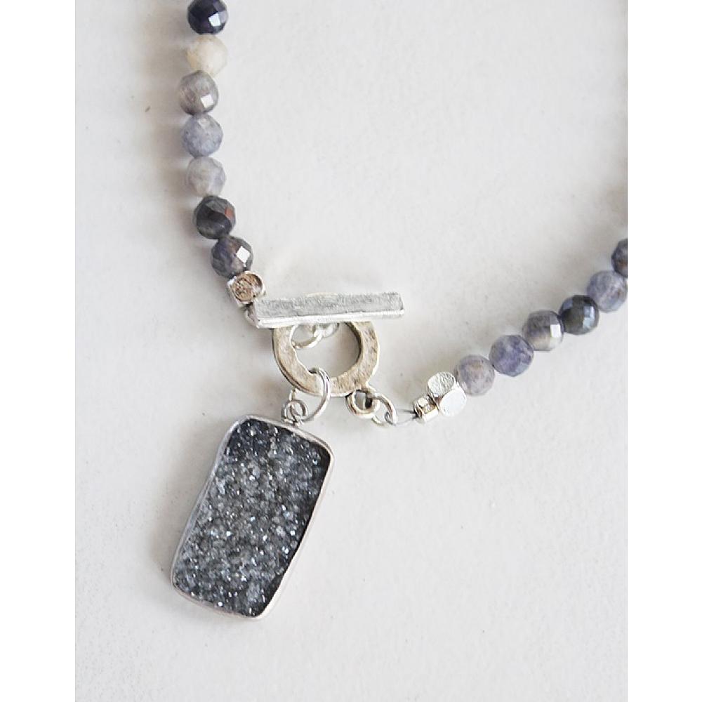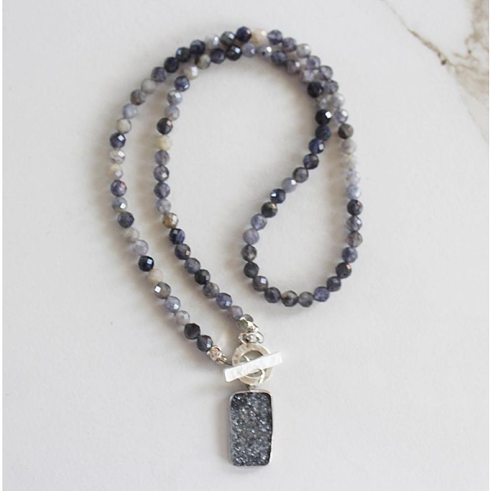 * Iolite, a watery dark blue with bits of clear, just like the Pacific Ocean. Beautiful faceted beads come together and is the anchor for this gorgeous rectangle Druzy pendant. I've secured this with a front loading silver toggle set. Don't forget to see the beautiful bracelet that matches this necklace.