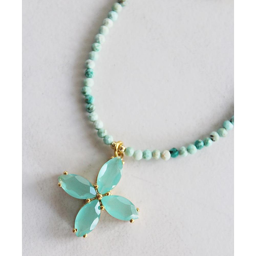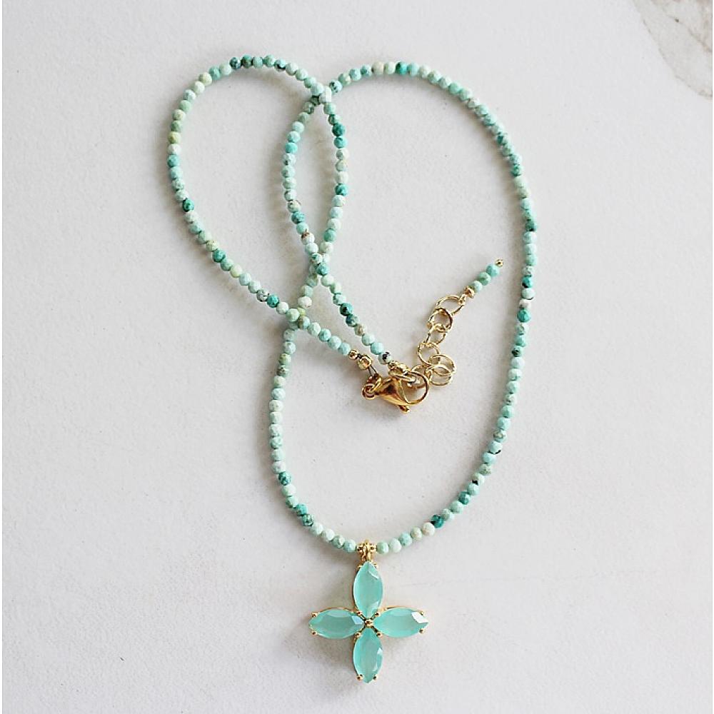 * Warm waters of the Caribbean . . . this Chalcedony color is just that. Imagine wading in the waters of Turks and Caicos. Yup, now you get it. This simple, and sweet flower shaped pendant dangles from a length of Blue/Green Amazonite. It's truly perfection. I've secured the necklace with a gold tone lobster clasp, and added a length of chain.