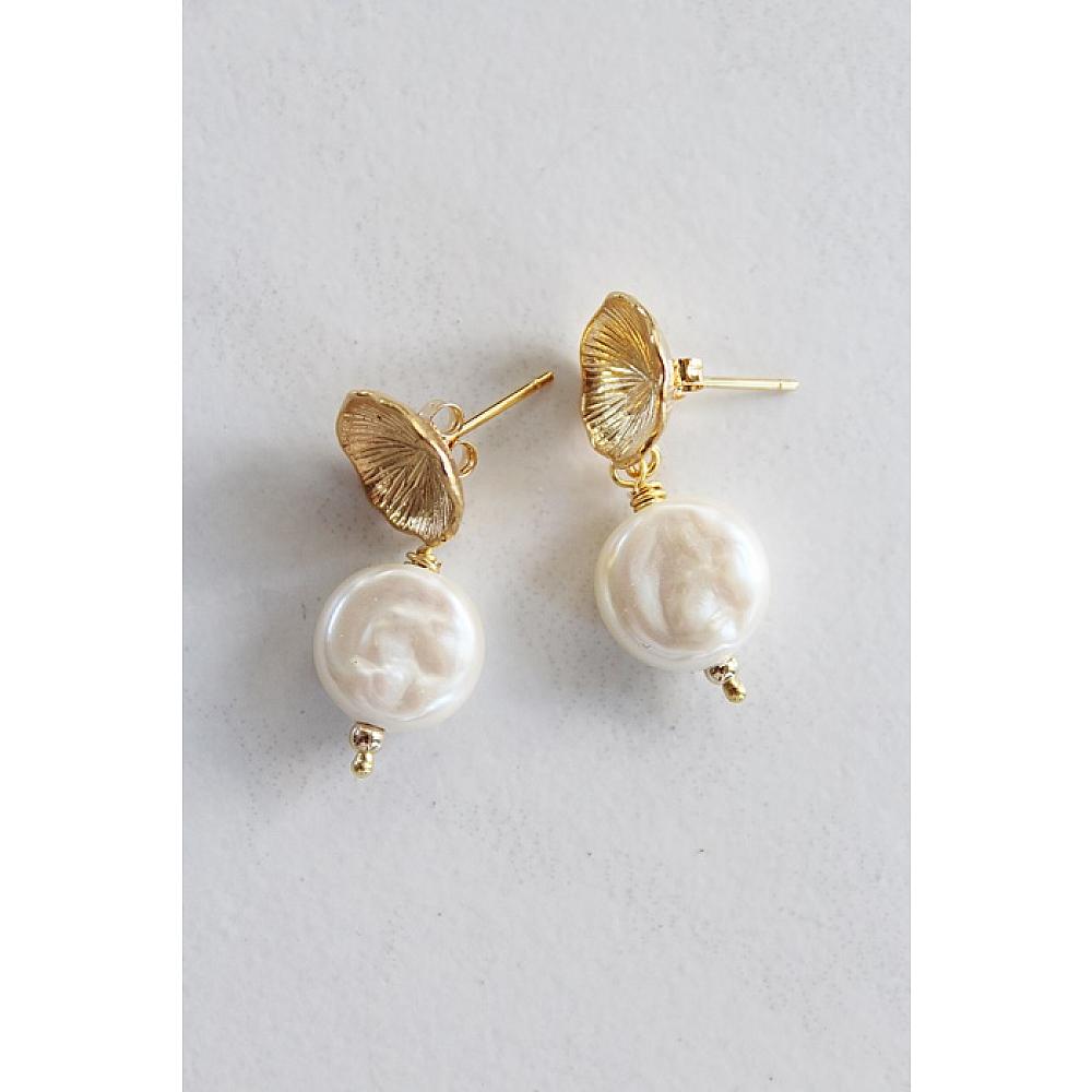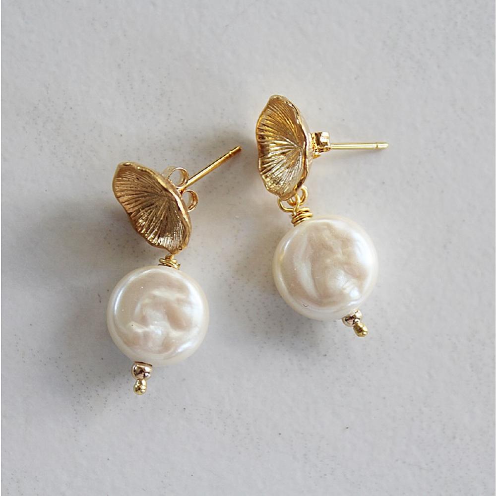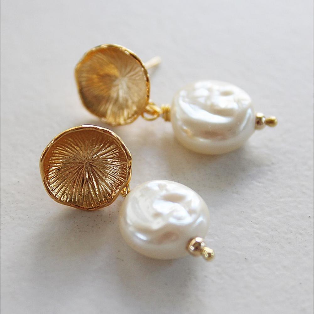 * Sweet, coin shaped Vintage glass pearls are anchored by a lovely etched gold post earrings. These are simple and a perfect pair for all of your summer events. The posts are 14kt gold plated.