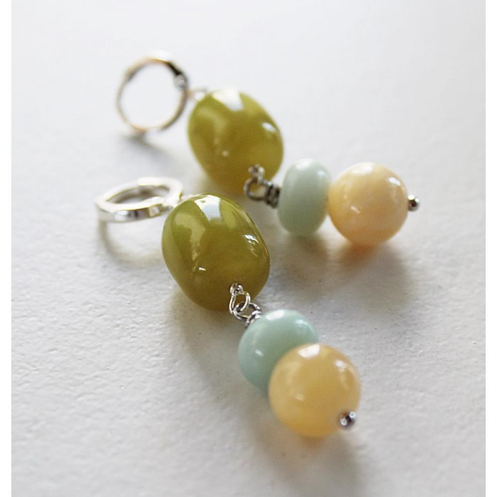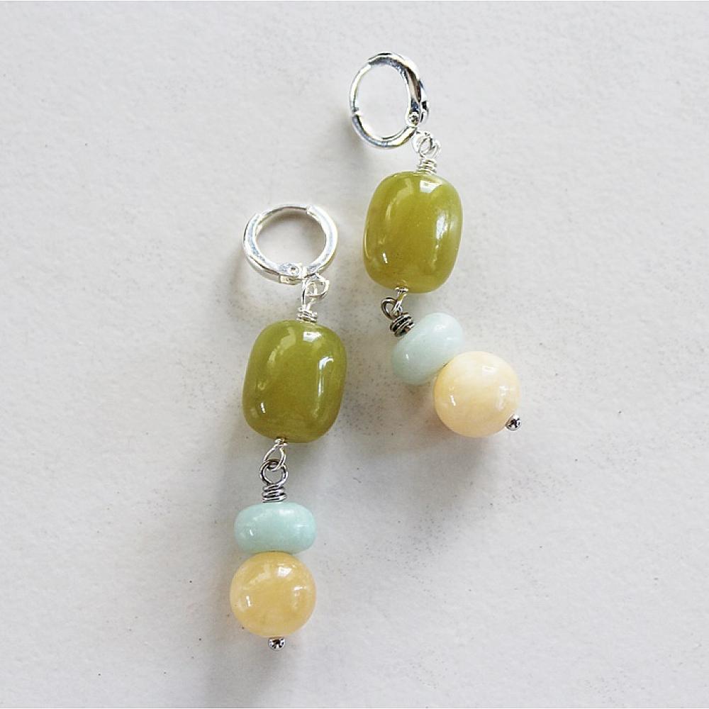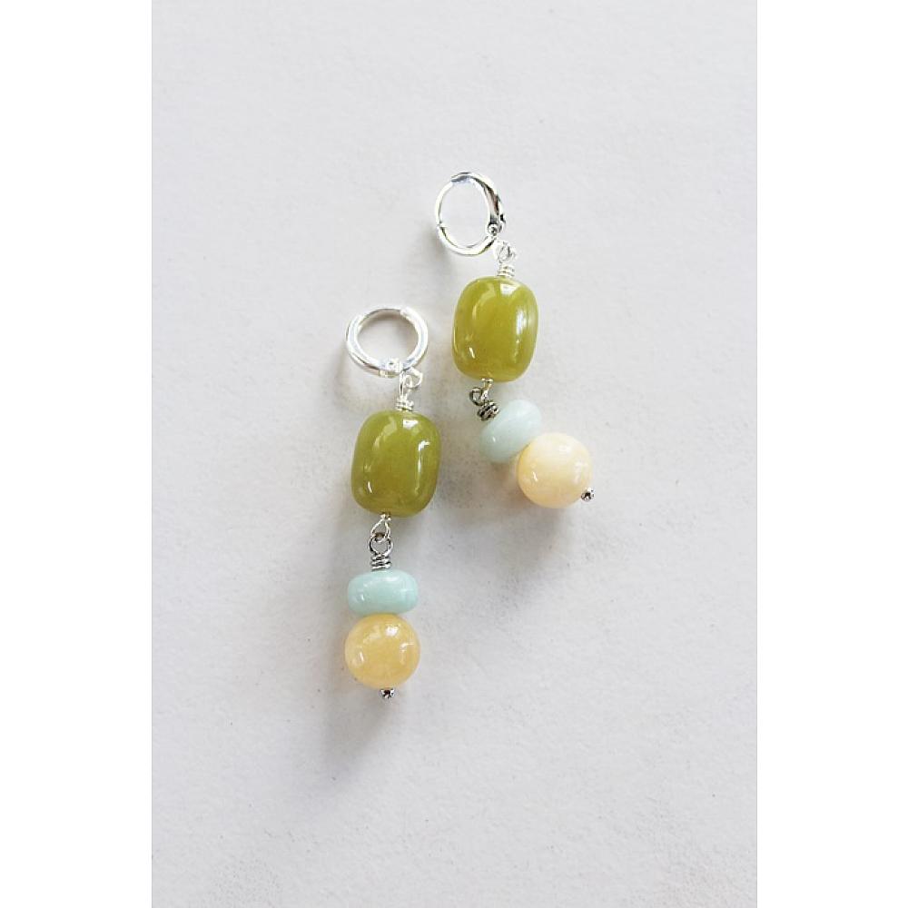 * This trio is so fun. Lime jade, Amazonite, and Agate come together on these fun earrings. The perfect summer casual earrings. I've hung them on sterling silver leverback earwires.