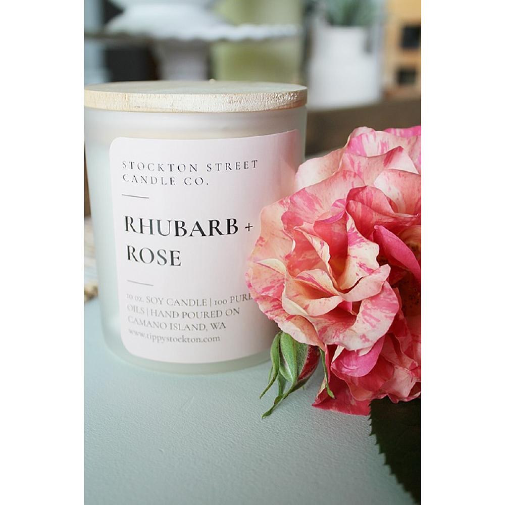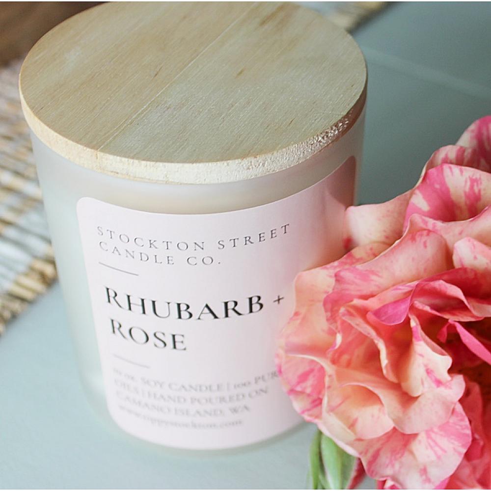 * Better late than never. Here's to JUNE. Tart rhubarb meets floral rose in a stunning blend. It's a lovely scent, evoking the floral/fruit of Summertime. This candle is 100% soy wax and environmentally friendly fragrance and hand poured by me in WA State. The candle is 11 oz. and comes with a wooden lid. Always trim your wick to 1/4" before burning, and never let your candle burn for more than 4 hours. Detailed instructions on the bottom of the glass jar.