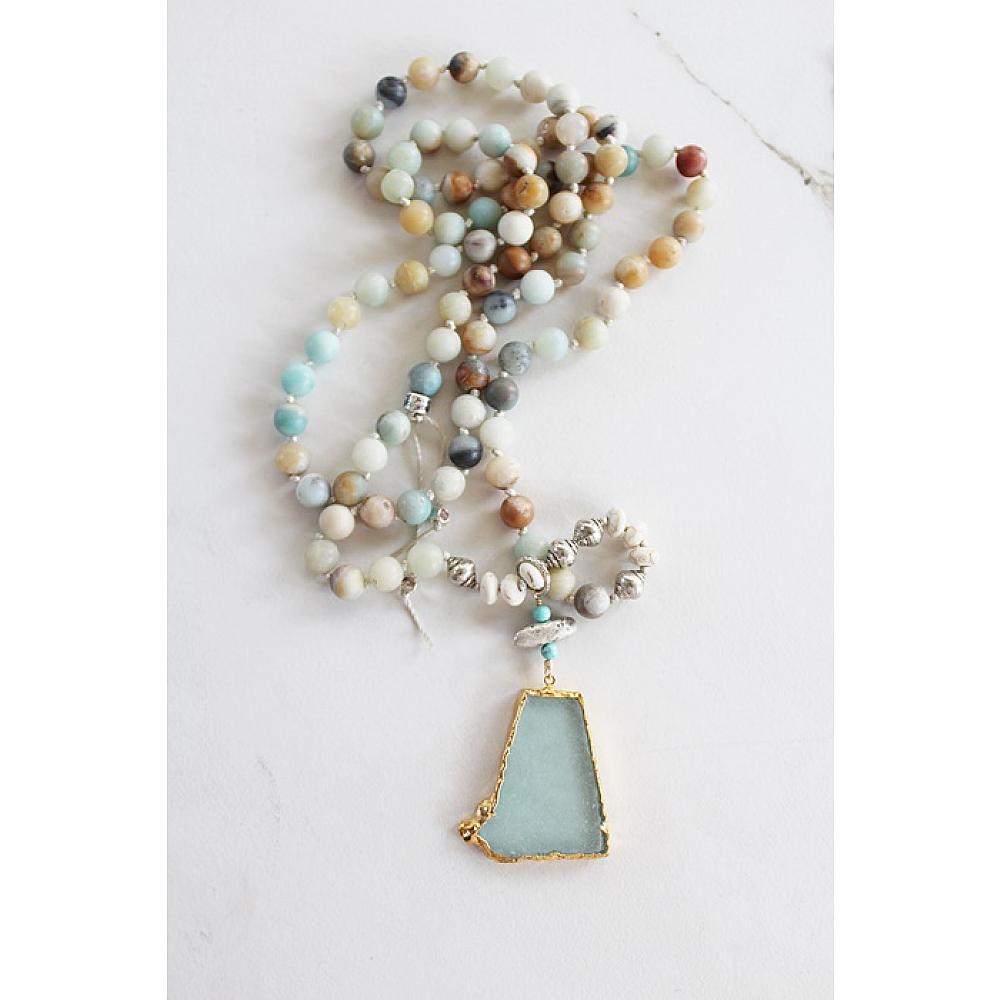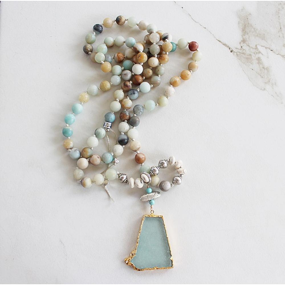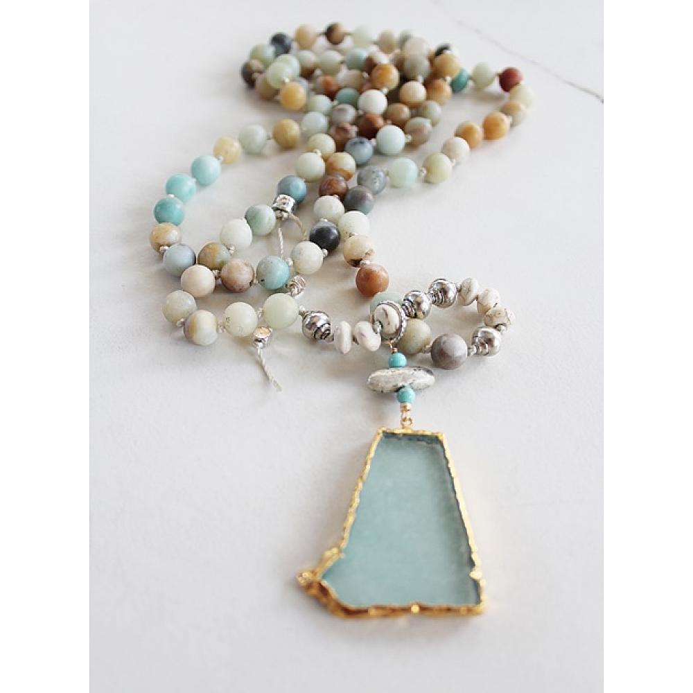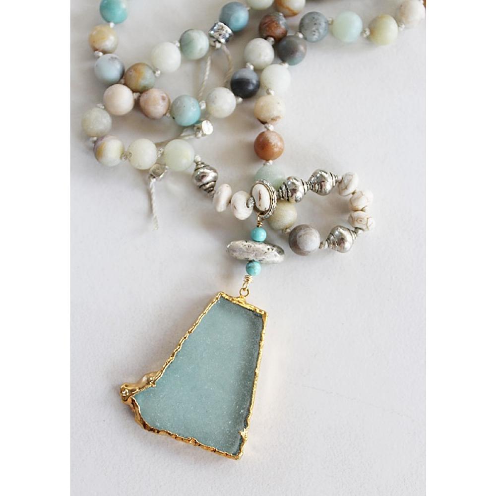 * This is the quintessential Summer necklace - the colors of the sea, sun, and sky all come together on this gorgeous piece. I've hand-tied smooth Amazonite beads onto heavy duty cotton - it's the anchor for the lovely, irregular shaped, gold wrapped beach glass pendant. The necklace is mixed metal - silver findings and the gold wrapped pendant. The necklace simply slips over your neck (in some cases you might get to double it up).