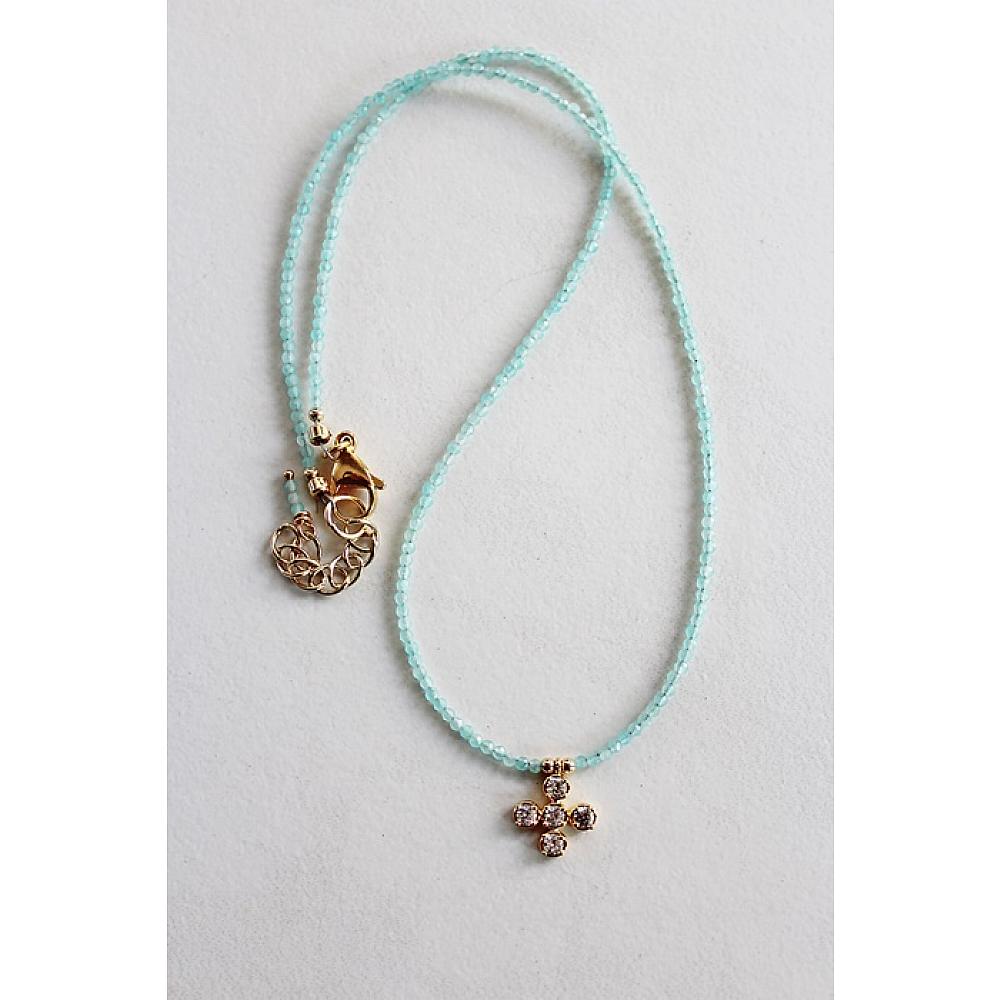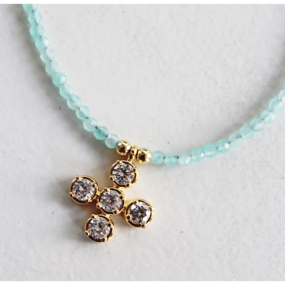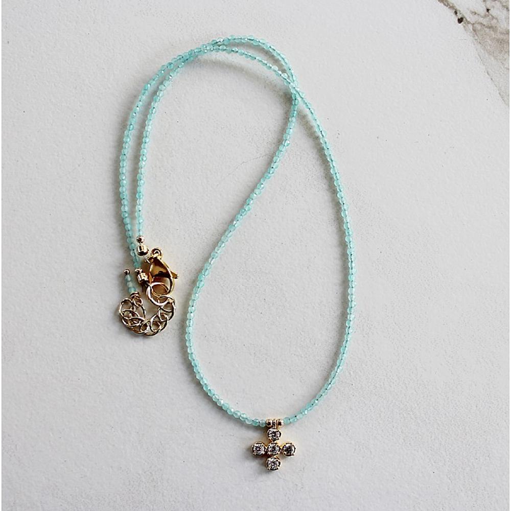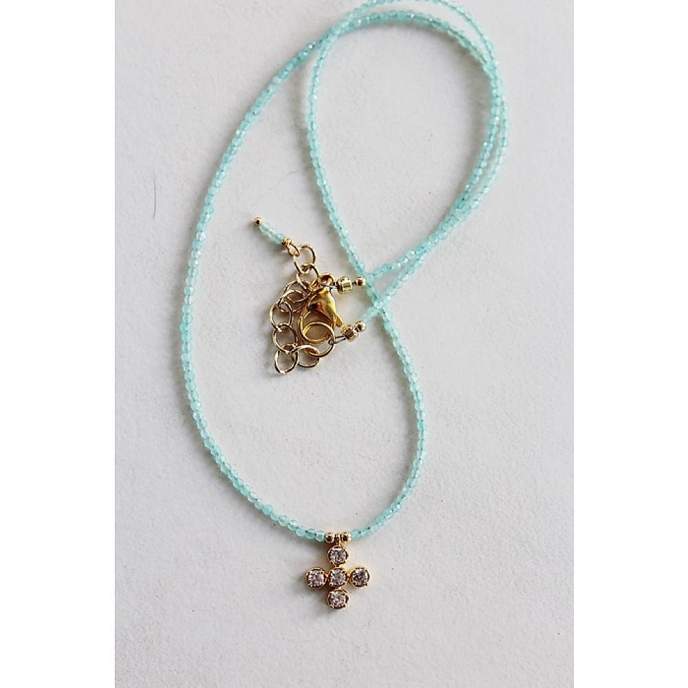 * Sweet and simple Aquamarine tiny rounds come together on this adorable necklace. A CZ cross dangles from the chain and is absolute perfection. I've secured the necklace with a gold lobster clasp and added a length of gold chain for an extender.