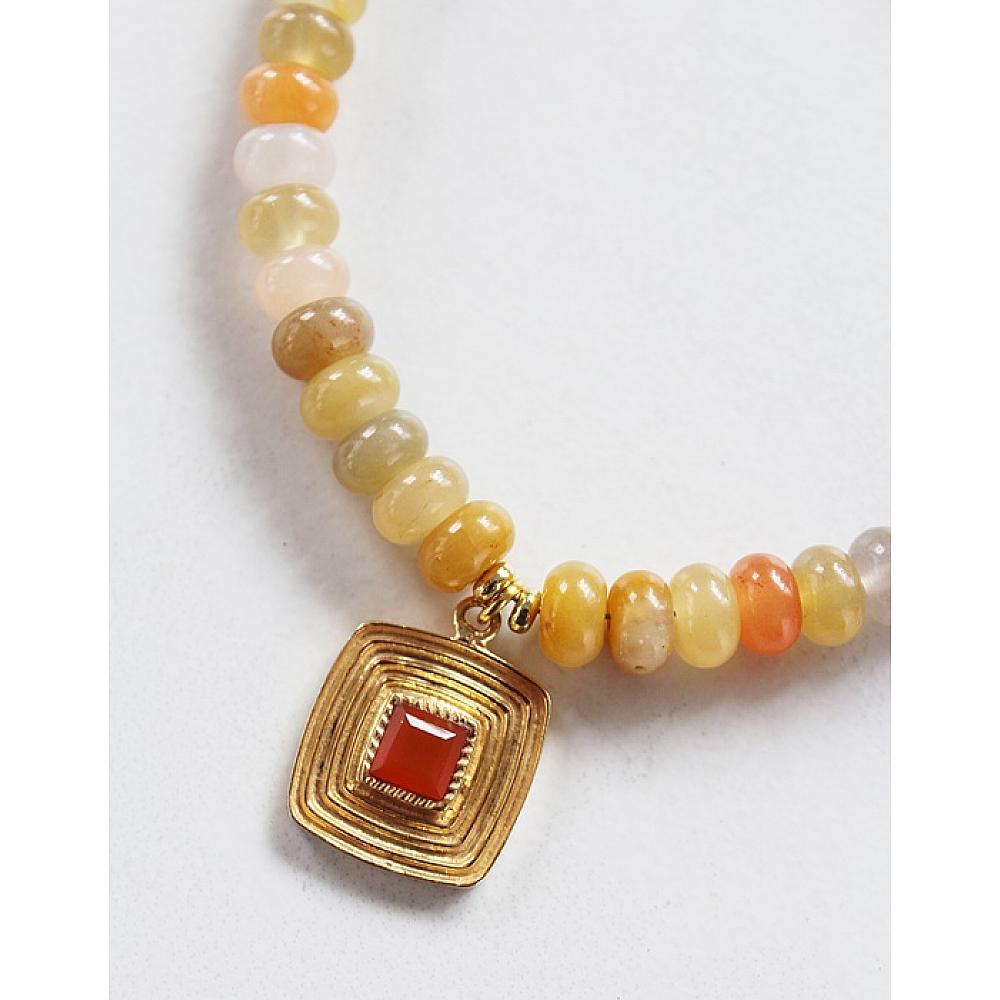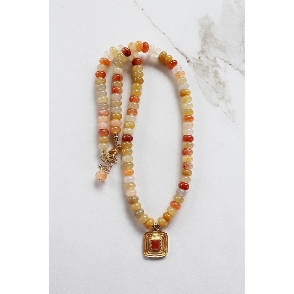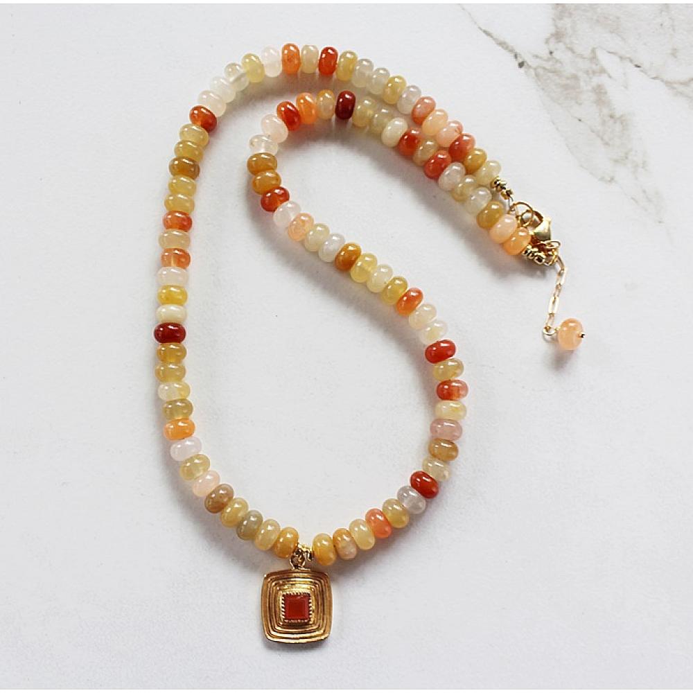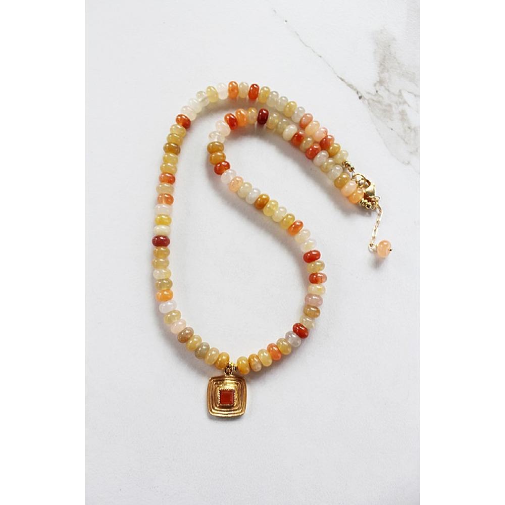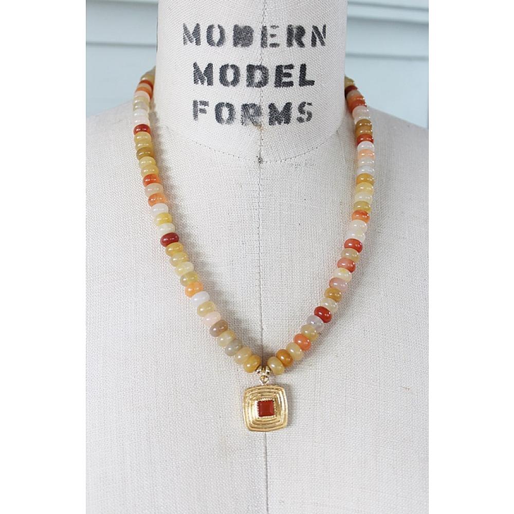 * I love this necklace. It's fresh and sweet and perfect for Summertime. The flower jade beads come in all shades of orange, melon, peach, a hint of green and yellow. I've anchored the necklace with a fun square gold pendant that's dotted with a Carnelian stone. So fun! The necklace is strung on heavy duty wire and I've added a gold ballon clasp, along with a 1.5" extender for added length.