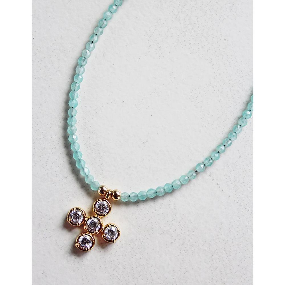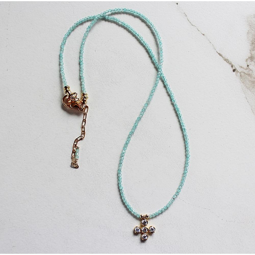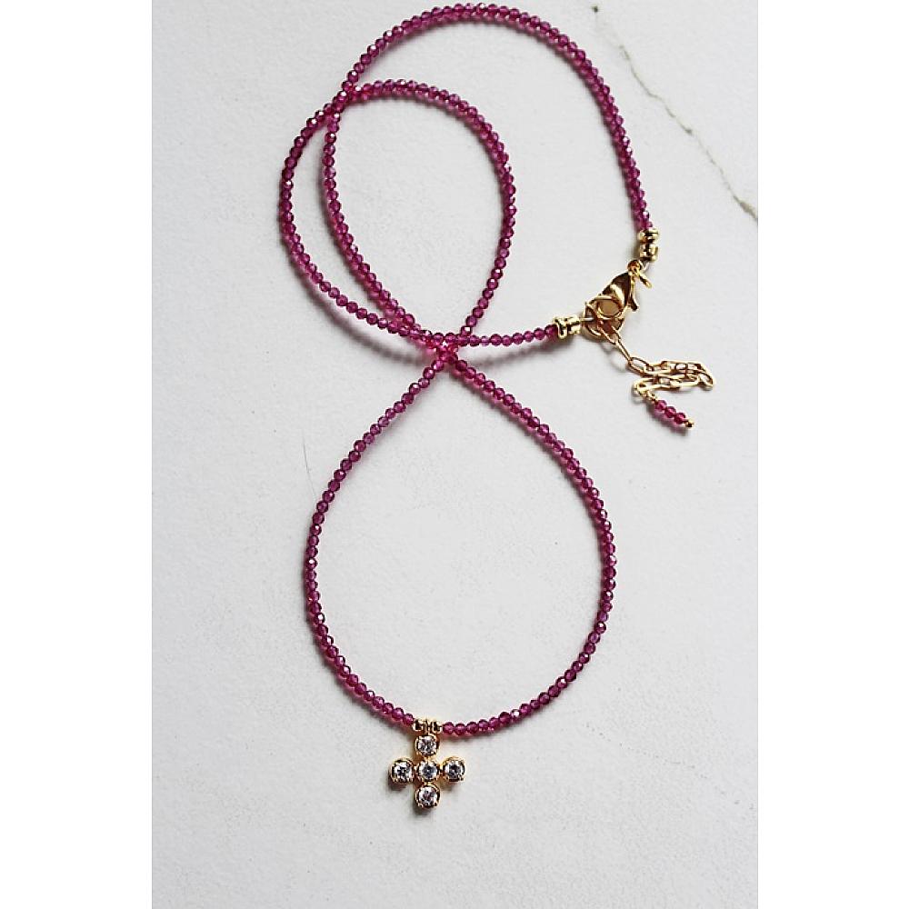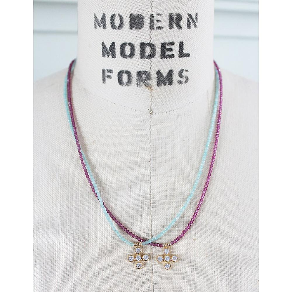 * This little sweetie is another one perfect for layering. Choose from either Micro gemstone Aquamarine or Ruby. I've strung these darling little beads on heavy duty wire which becomes the anchor for this darling little CZ cross. The necklace is secured with a lobster clasp and a 1.5" extender. Choose your stone from the drop down menu.