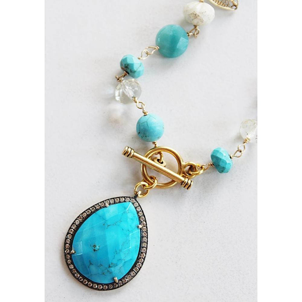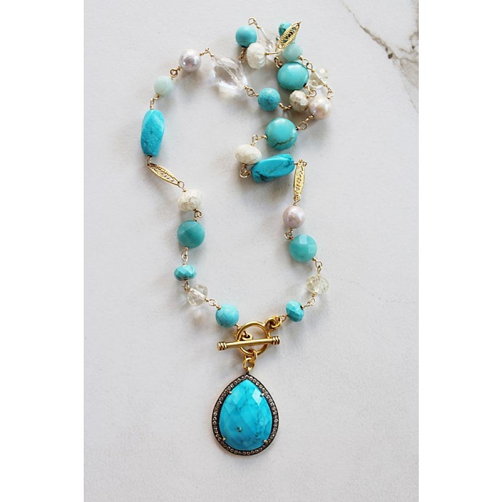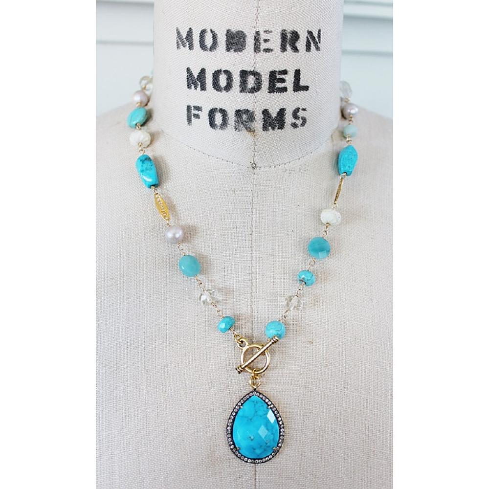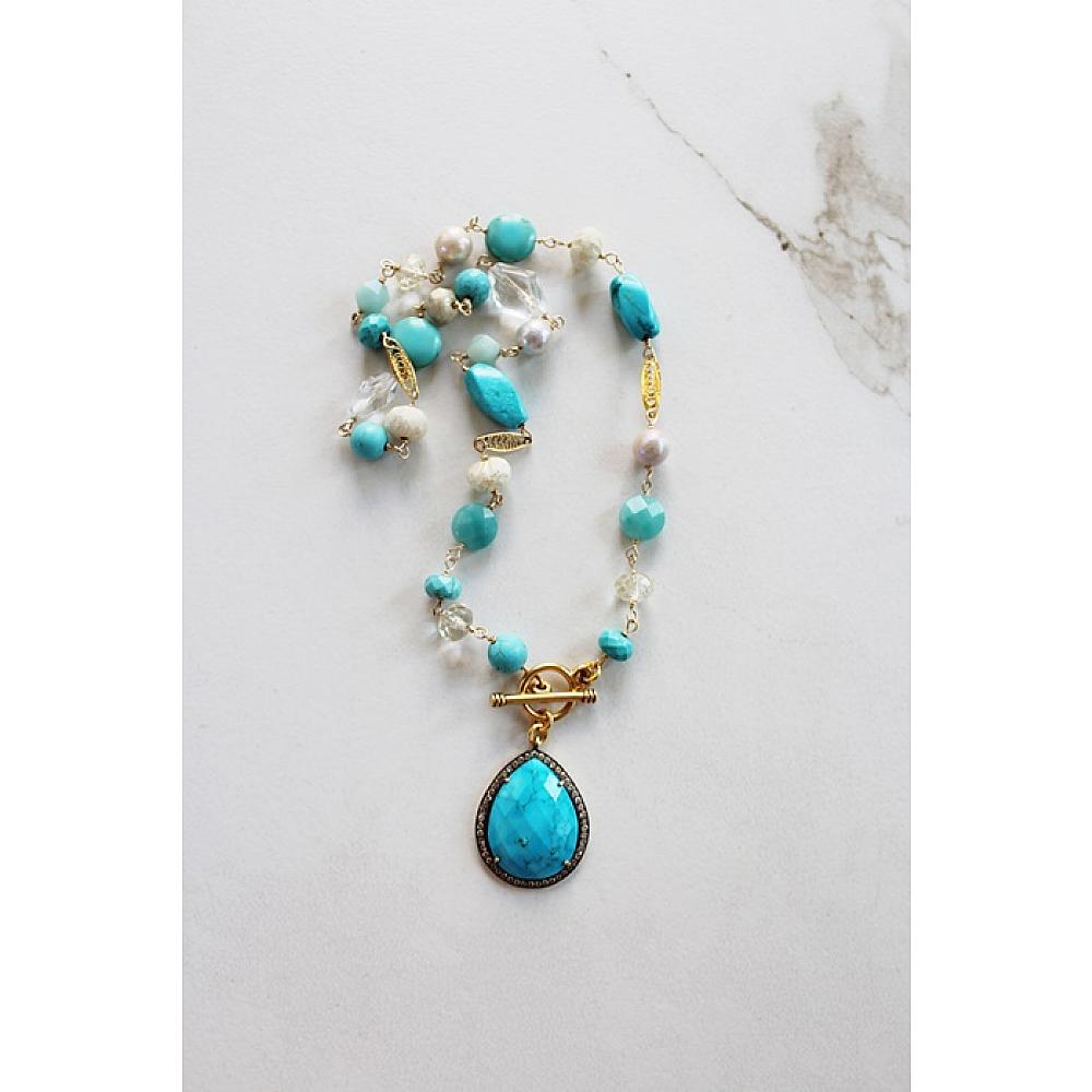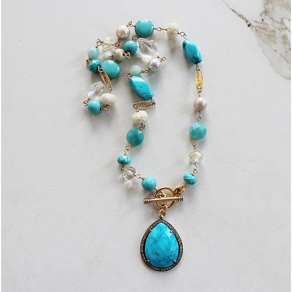* I love this mixed Turquoise necklace. From coin shape, to barrel, to glass, to fresh water pearl, this necklace has it all. The beautiful, hand wired necklace is the anchor for this gorgeous Turquoise and CZ studded pendant. I've hung the pendant on a simple, front loading, gold toggle set. Absolute Summer perfection.