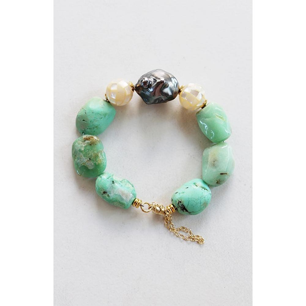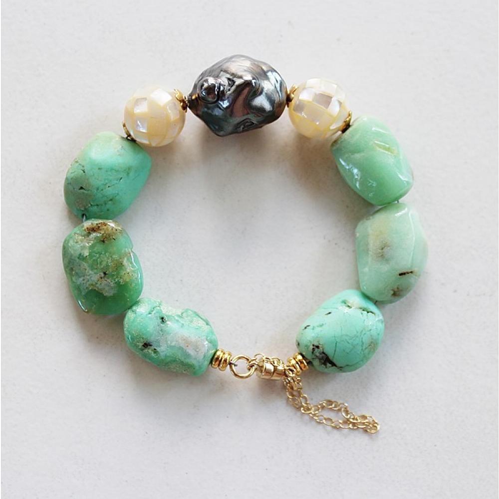 * Chunky Chrysoprace is the anchor for a gorgeous dark gray Baroque fresh water pearl and mosaic MOP beads. Truly such a pretty combination. The bracelet is secured by my signature 14kt gold fill magnet clasp. This pairs perfectly with the Meghan Necklace.