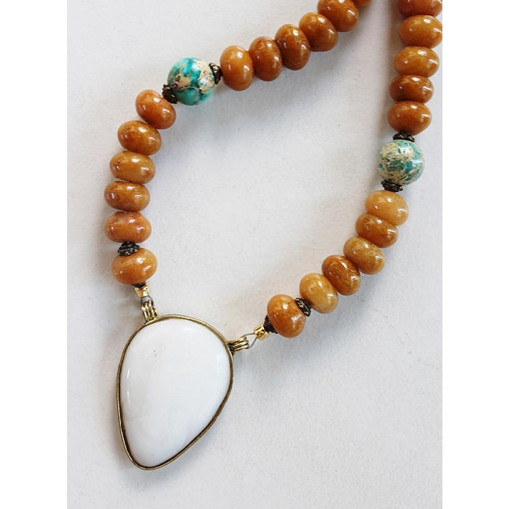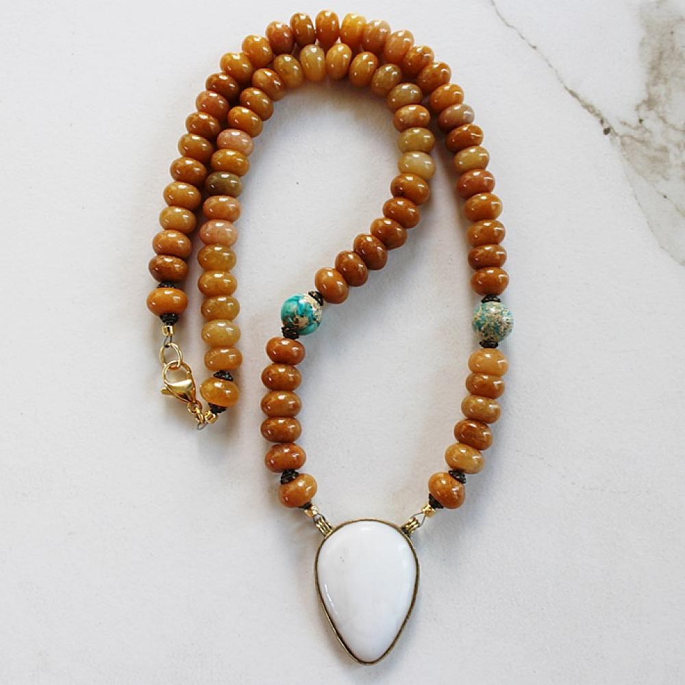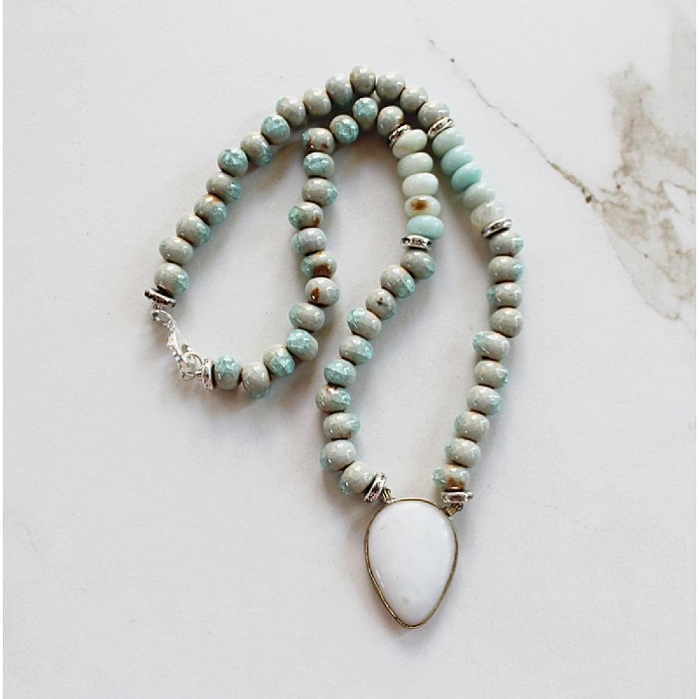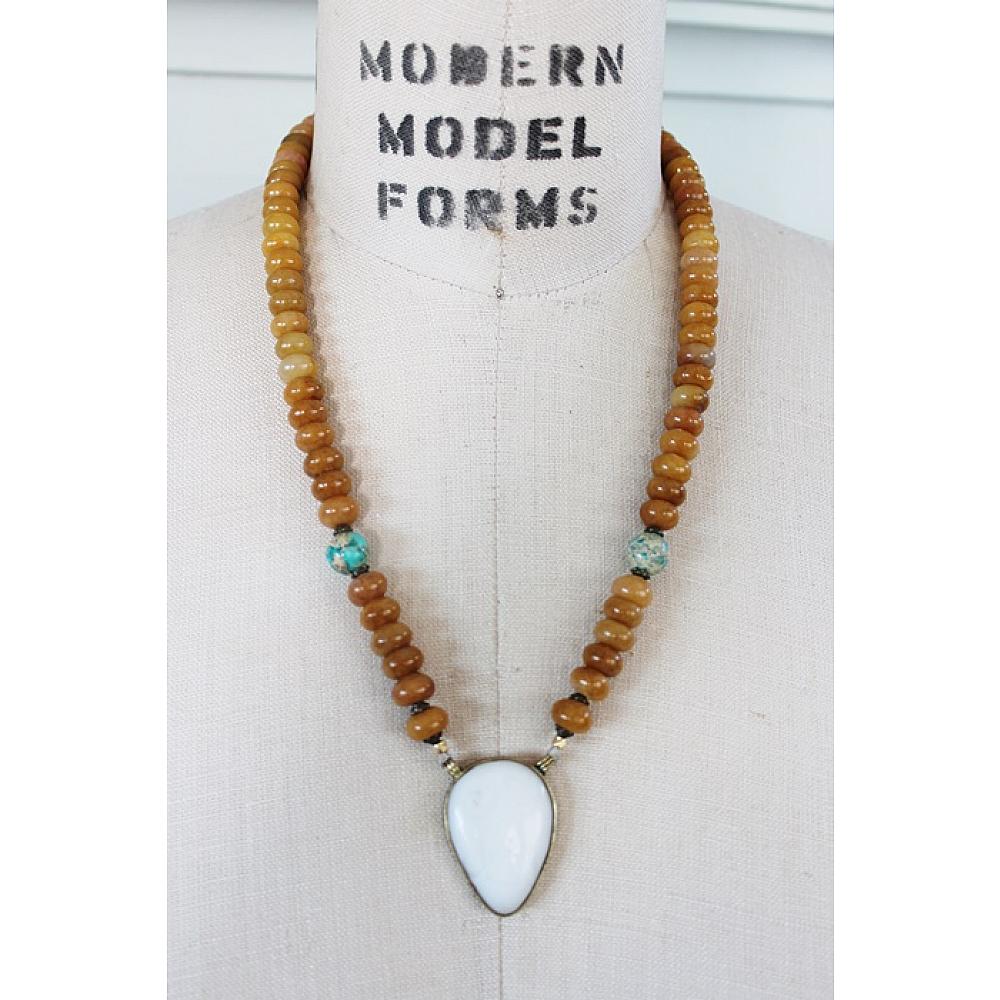 * This fun necklace comes in two different ways - one has sea blue Czech Glass, the other a beautiful rondelle golden agate. Both come with the same sweet white agate pendant. They are secured with a gold lobster clasp on the golden amber, and silver on the Czech glass version - each has it's own different accent beads. A stylish and fun summer time addition to your wardrobe.