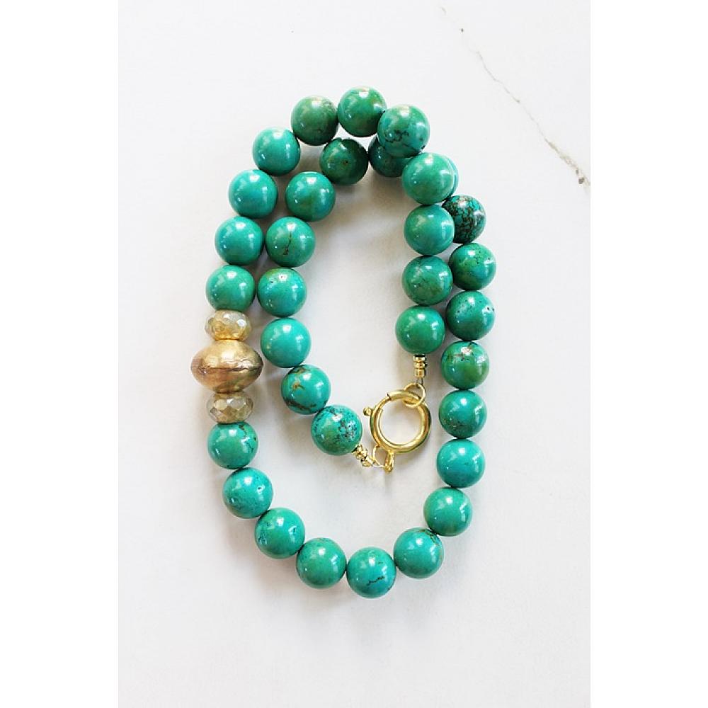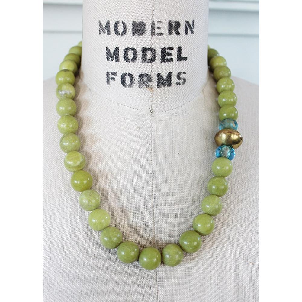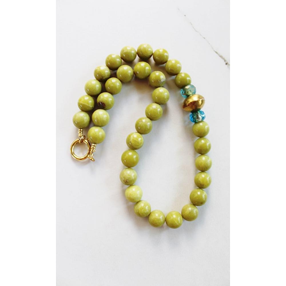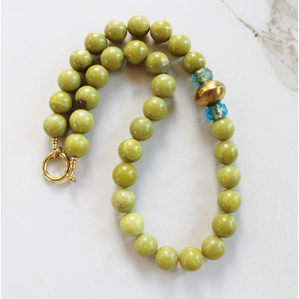 * Choose from 14mm Turquoise or Lime Jade beads on this fabulous statement necklace. For a fun spin, I've added a large brass bead along with a couple of Czech glass beads for interest. The necklace is strung on heavy duty wire and features a large circular clasp. Choose your stone from the drop down menu.