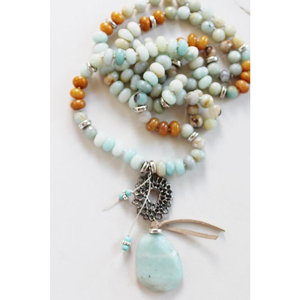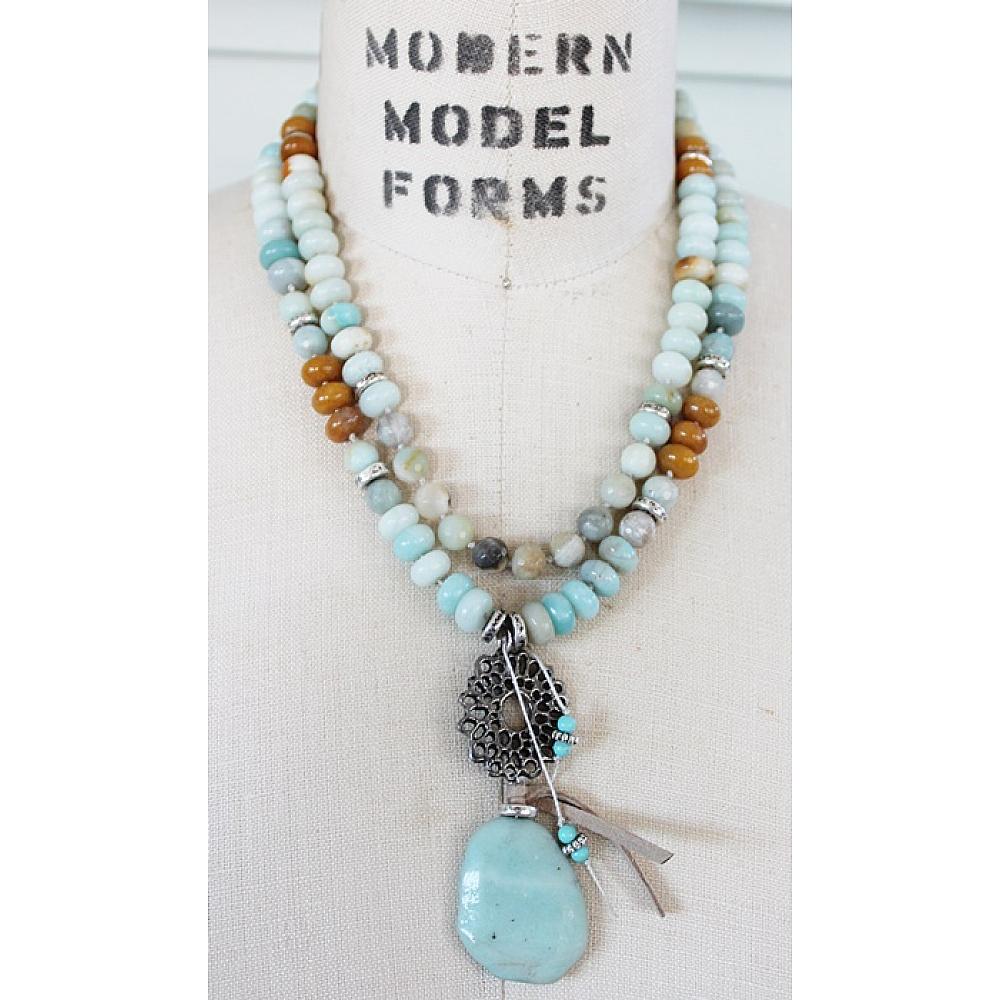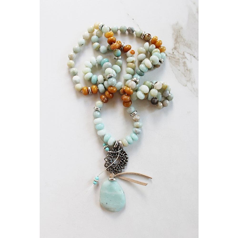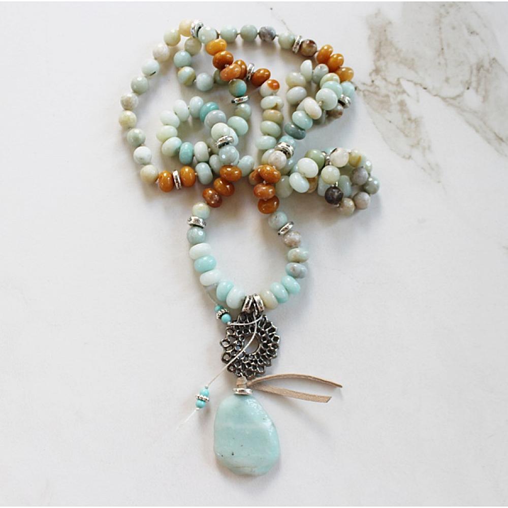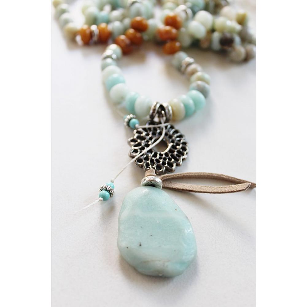 * This one screams Summer. All the color ways of summer. Sky, Beach, Sunset, all in one gorgeous piece. I've handtied each bead on heavy duty cotton and added a fun sterling silver spacer and for the pendant, a chunk of Amazonite. It's long, and if you're lucky enough, you could wrap it twice for a lovely statement necklace.