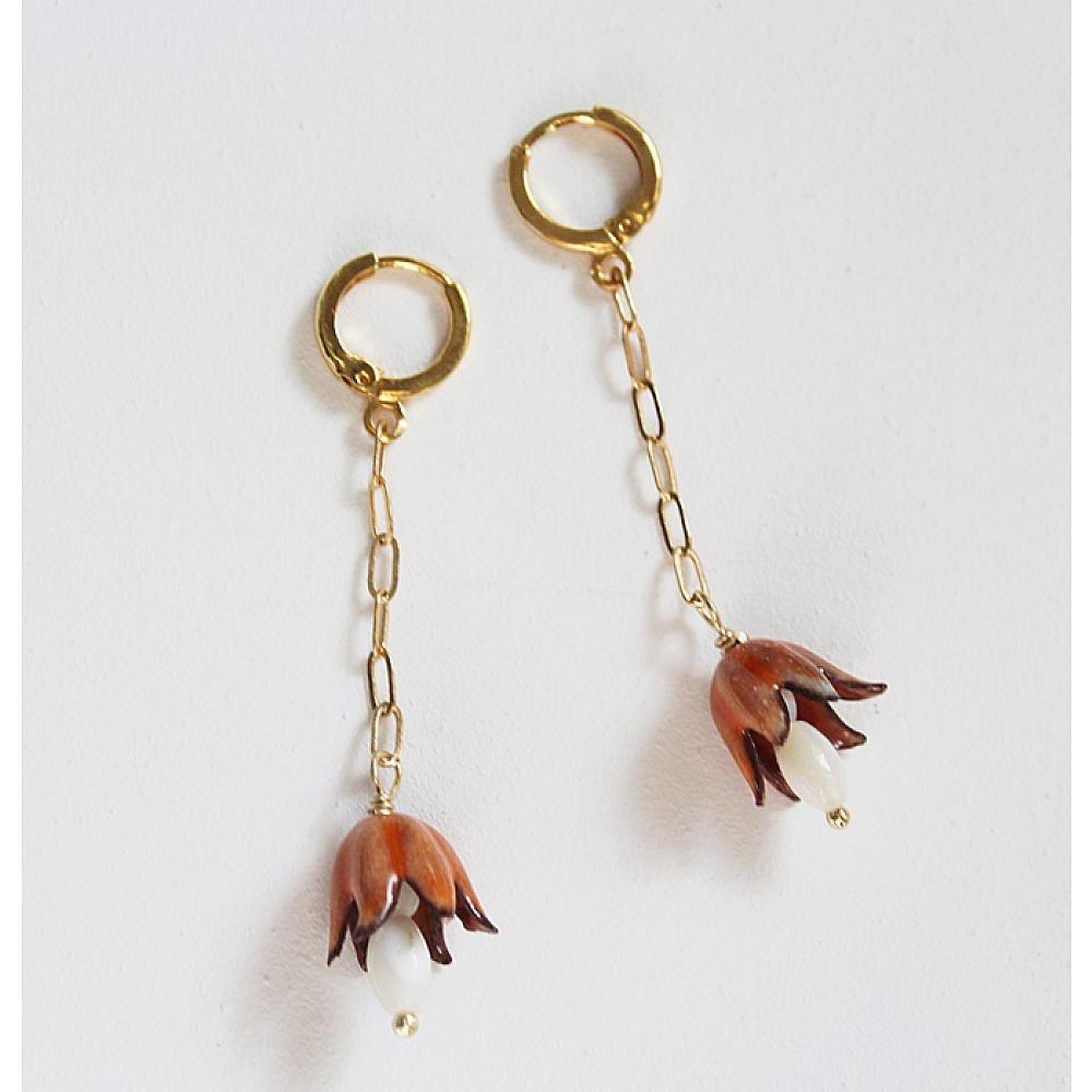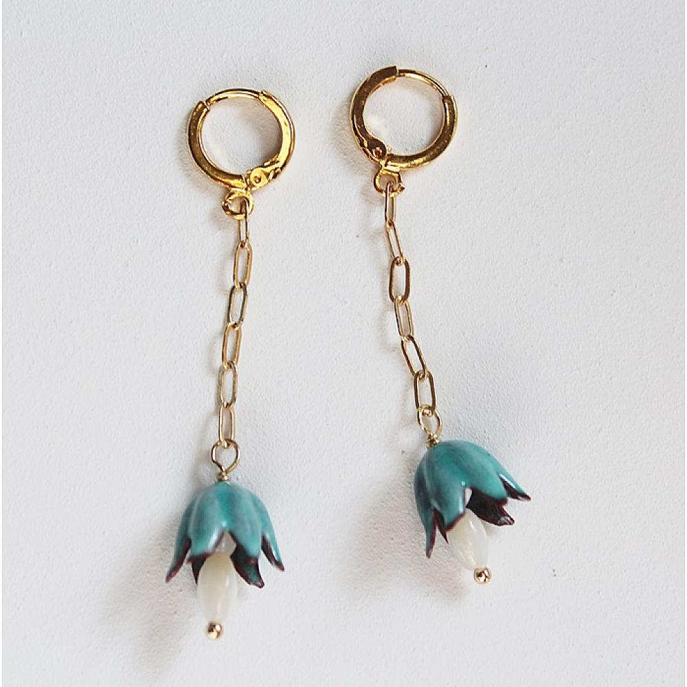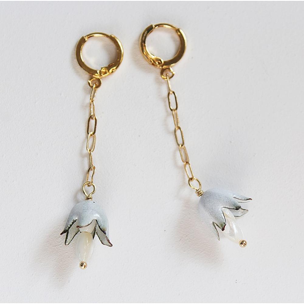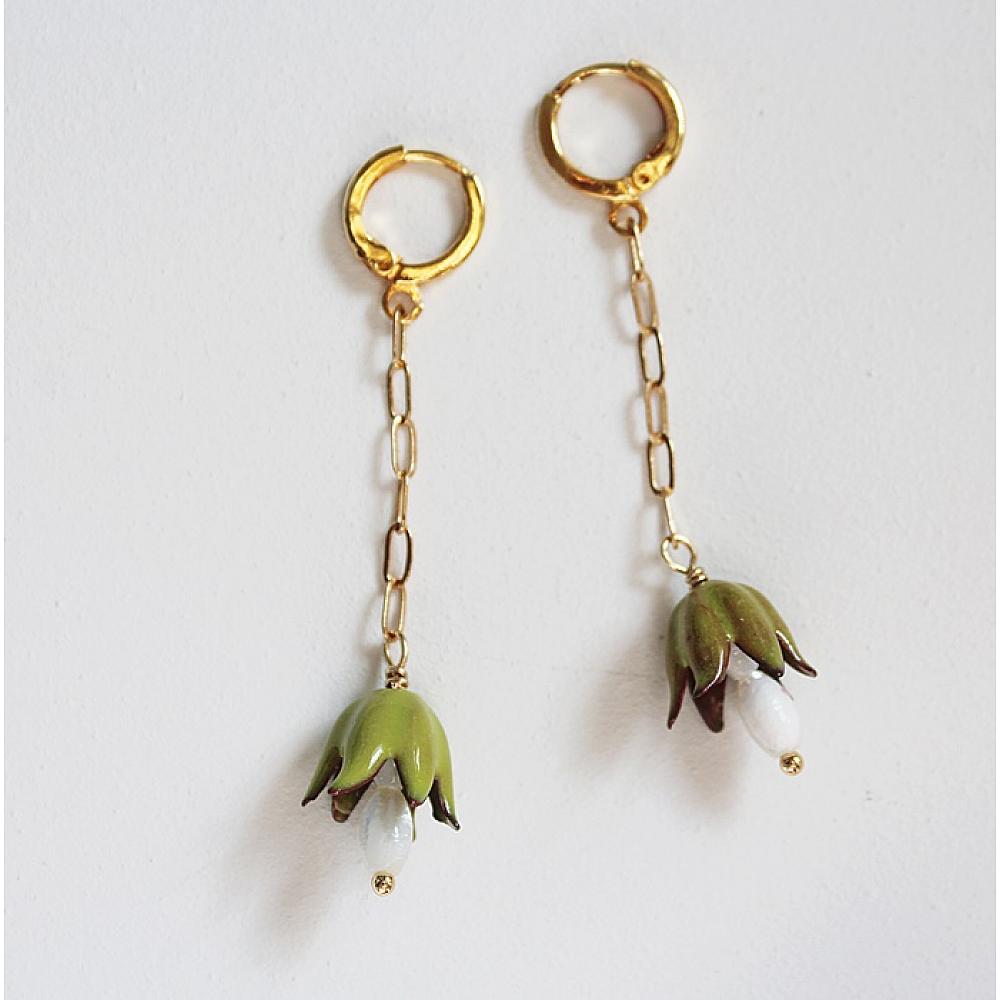* I couldn't love these earrings more. Sweet, handmade enamel floral drops dangle from a length of gold chain. Super simple and super swingy. They come in several colors - choose yours from the drop down menu. The earrings are hung on 14kt. gold filled leverback earwires.