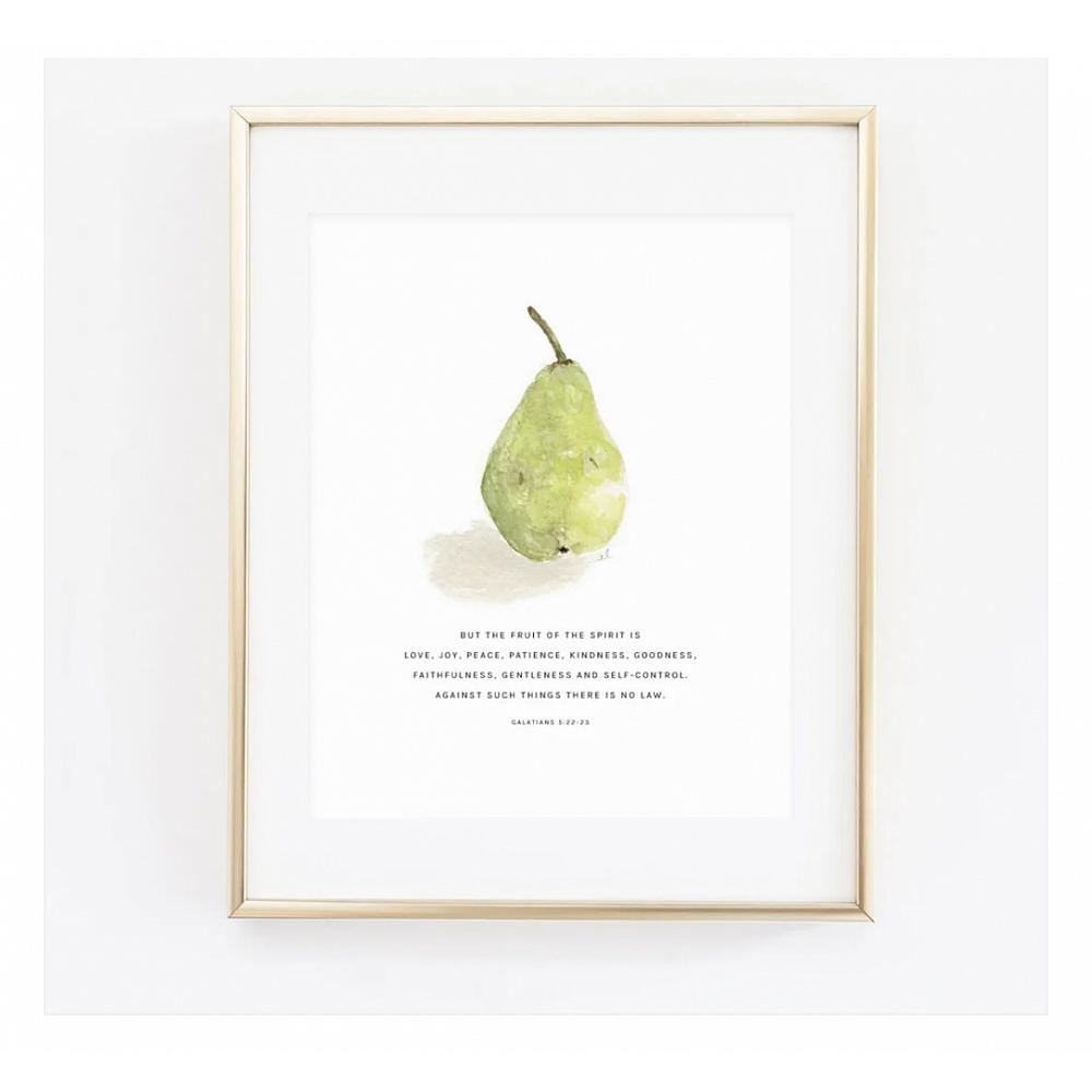 * Fill your walls with beauty and truth. Display this lovely print around your home for daily reminders of the fruit of the spirit. Pear watercolor illustration with Galatians 5:22-23 "But the fruit of the spirit is love, joy, peace, patience, kindness, goodness, faithfulness, gentleness and self-control. Against such things there is no law."