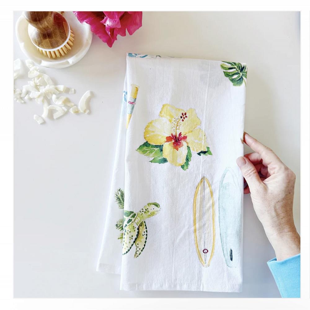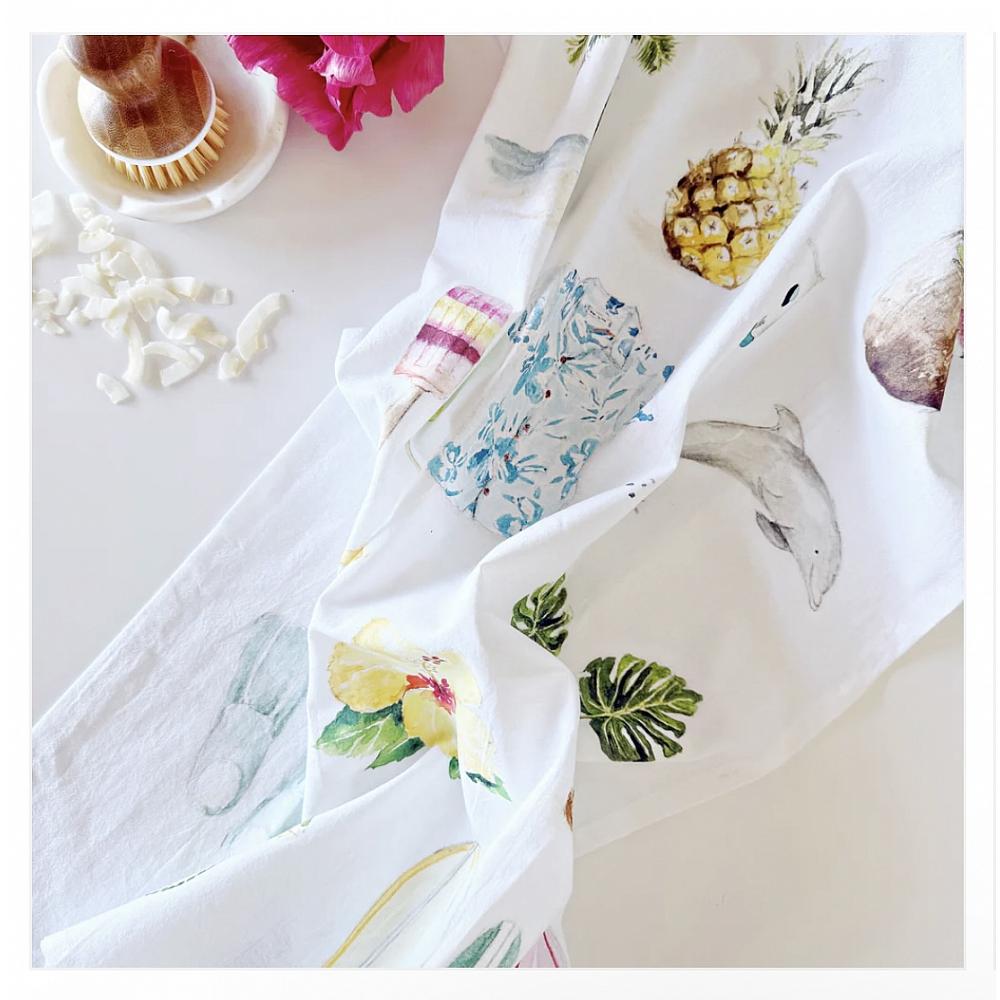 * Add a touch of delight to your kitchen with this 100% cotton tea towel. Tropical illustrations cover the towel making it perfect for washing up, lining a basket, or displaying.