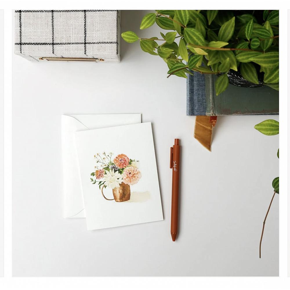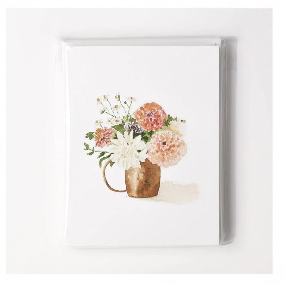 * Send sweet greetings to your loved ones. These Dahlia Bouquet notecards are blank on the inside with a charming watercolor illustration of a bouquet on the front. They bring a touch of cozy cheer to your thank you notes, get well wishes, and more.