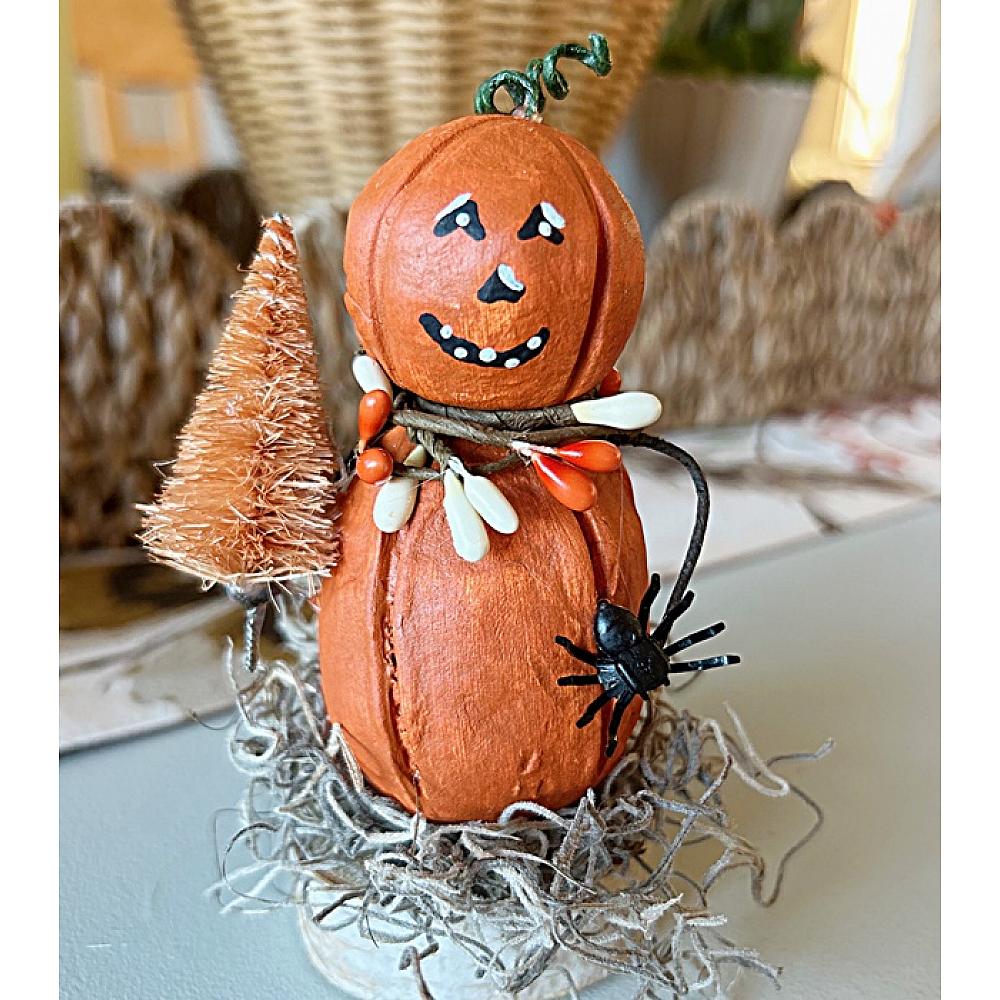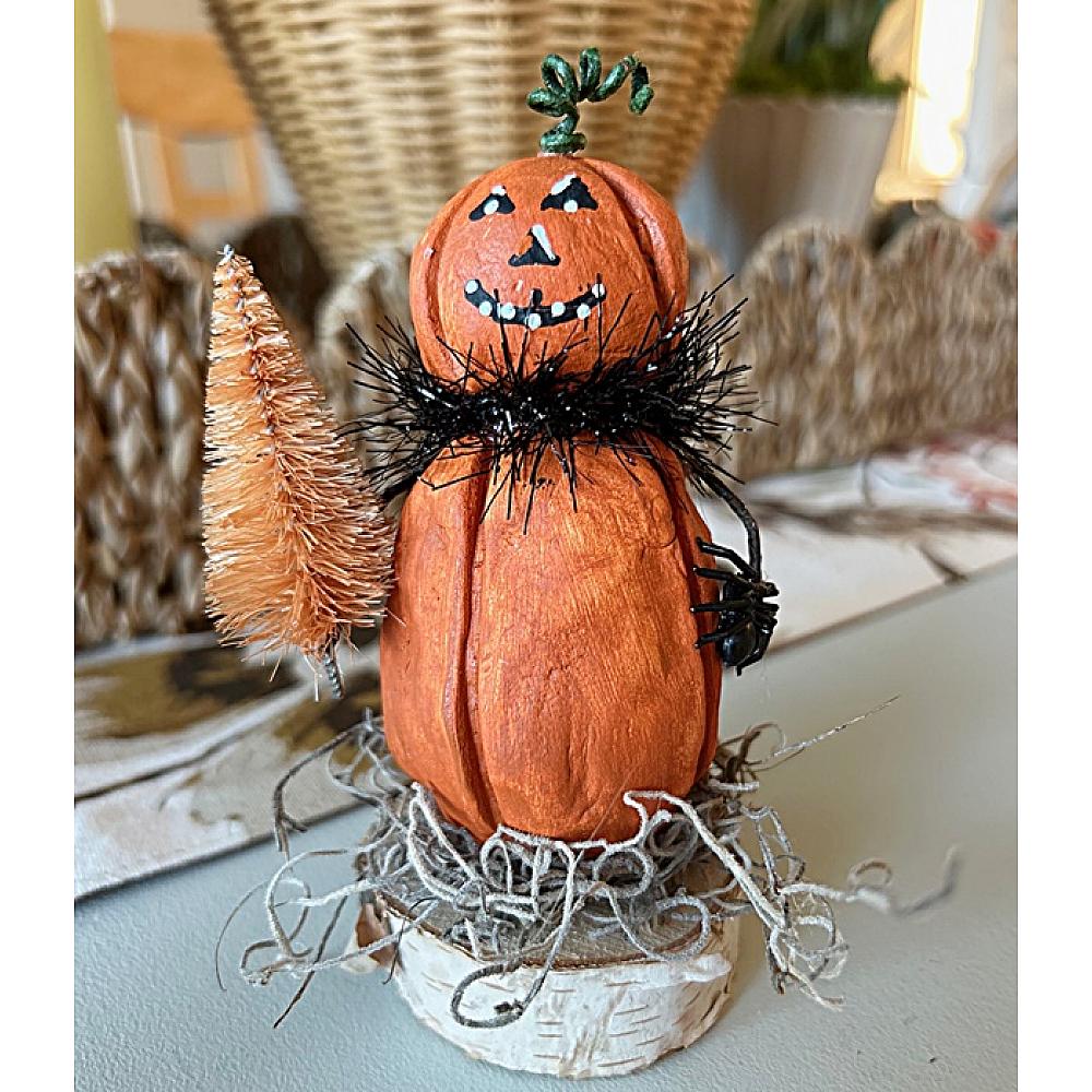 * A twist on my Holiday Snow People . . . introducing HAPPY. This darling paper clay pumpkin has been handcrafted by me and is the perfect way to usher in Halloween. The HAPPY pumpkin sits on a slice of wood and carries an orange bottle brush tree in one hand, and a scary spider in the other. Choose between a beaded collar or a black tinsel boa.