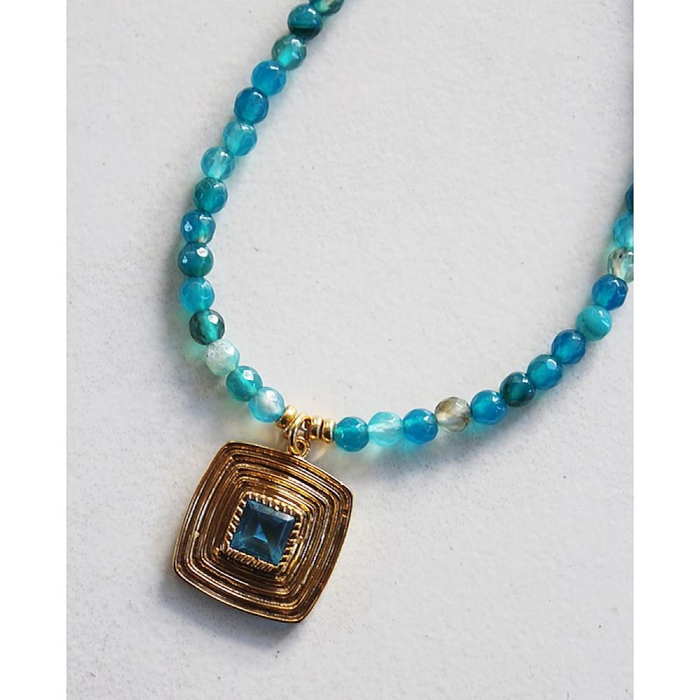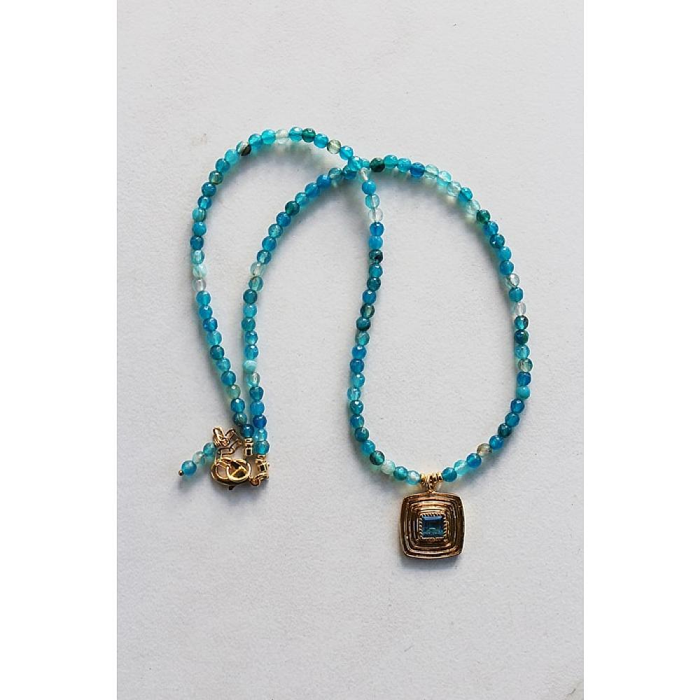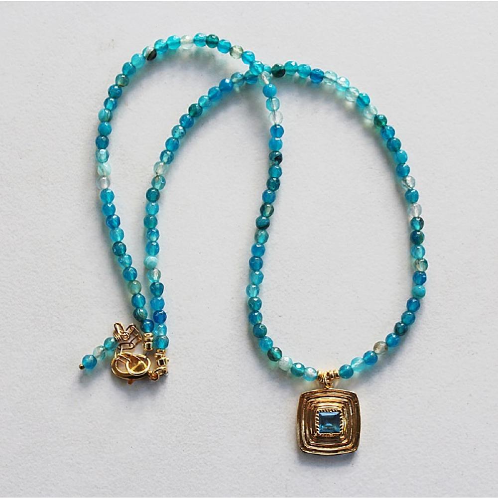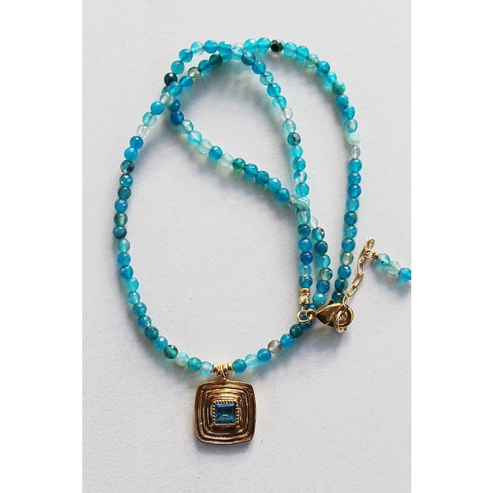 * Sky Blue Line Agate faceted beads come together on this lovely necklace. They form the anchor for the Blue Topaz pendant . . . such gorgeous colors. The necklace is secured with a gold lobster clasp and includes a gold beaded extender.