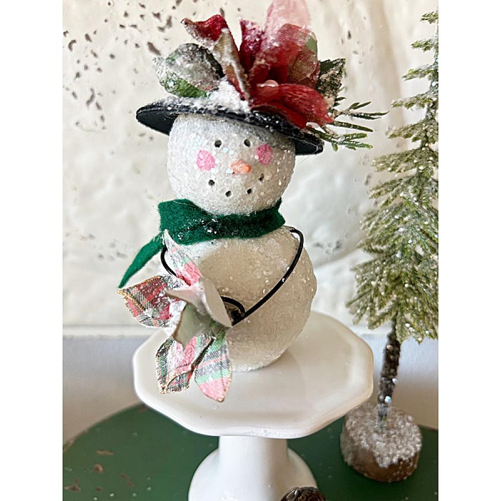 * A darling little snow lass to add to your collection of Tippy Stockton creations. Blossom is all decked out for the Holiday with a felt hat that's been adorned with flowers and leaves, and she holds a plaid wreath in her wire arms. The snowpeep is made from paper clay that has been formed and dried to snowgirl perfection. She sit's atop a vintage metal tart pan complete with snow so she doesn't melt away. *Please note - Blossom will have a metal tart pan stand when she arrives at your home - the snow on the tins was not frozen at the time the photographs were taken.