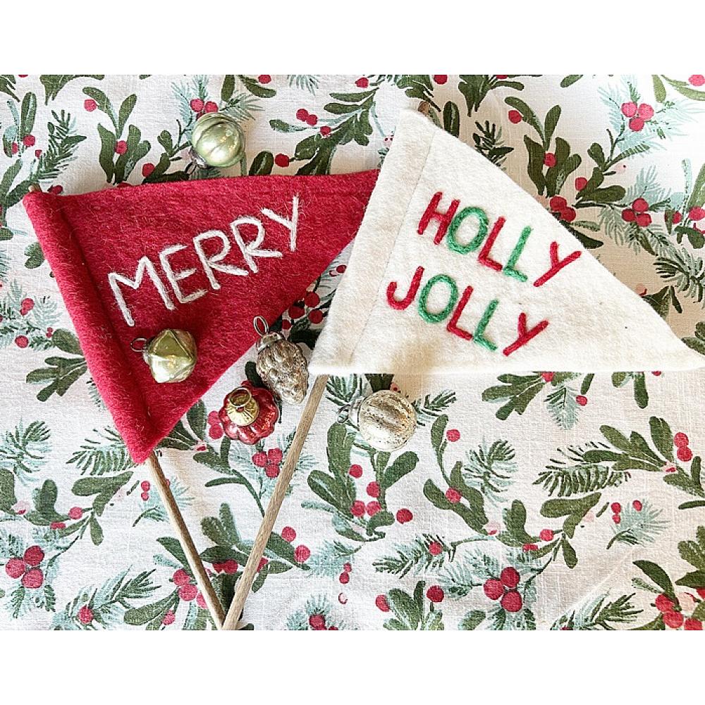 * It's Christmas! I couldn't resist adding these darling felt pennants to the site in my new HOME Collection. Welcome the season with these cute flags that hail the season . . . make your choice from the drop down menu. Choose from: MERRY, HOLLY JOLLY, and THANKFUL! The pennants are handmade and include the dowel for tucking in a plant or arrangement, or add it to the top of a Christmas present.