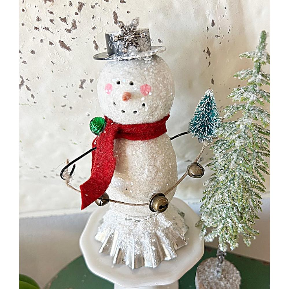 * Introducing Connor, Casey's twin. Connor is holding onto a string of bells and a Christmas tree in one hand. The snowpeep is made from paper clay that has been formed and dried to snowboy perfection. He sit's atop a vintage metal tart pan complete with snow so he doesn't melt away.
