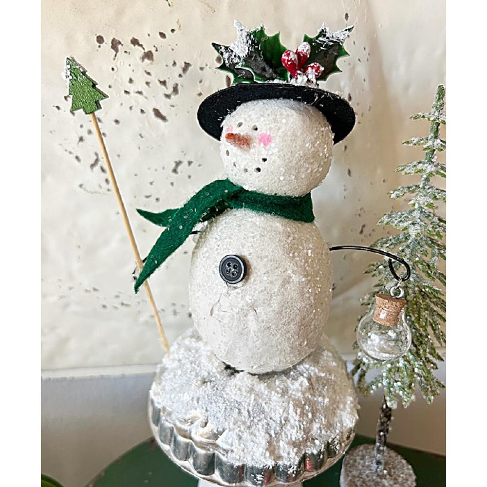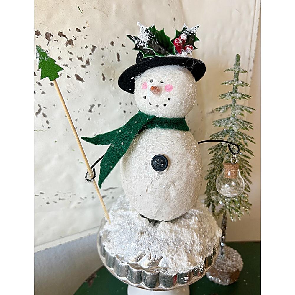 * He's a OOAK, and he's oh so special. Freddy sits atop a Vintage Tart pan covered in snow. He's a larger snowpeep, and carries the tree like a torch in one hand, and a snowglobe filled with stars in the other. Freddy is Jack's brother, and he's gonna steal your heart.