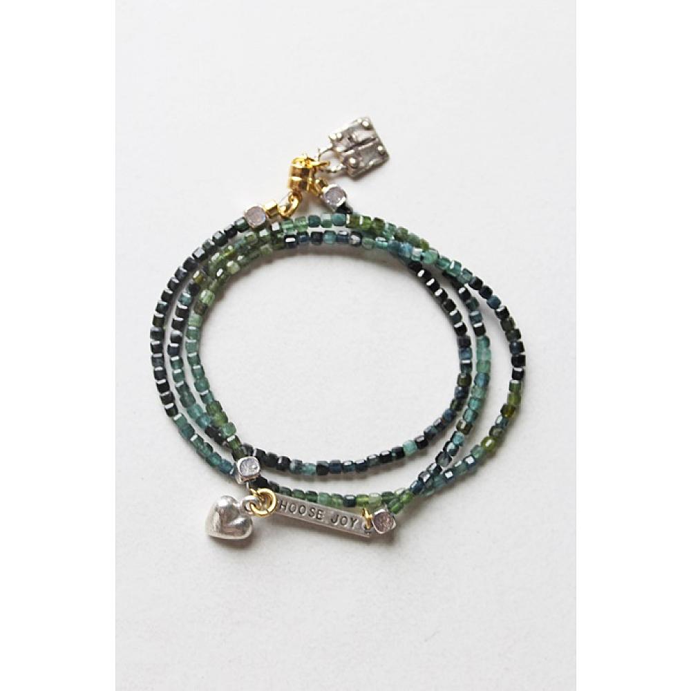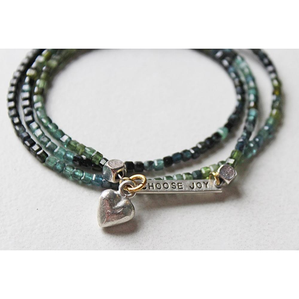 * It's back again, but this time in this gorgeous blue/green tourmaline in this most beautiful shaped bead. Square beads in varying shades of blue and green come together on this bracelet. The triple wrap bracelet features the CHOOSE JOY bar along with silver findings and a heart and sterling silver cross. I've secured the bracelet with my signature sterling silver magnetic clasp.