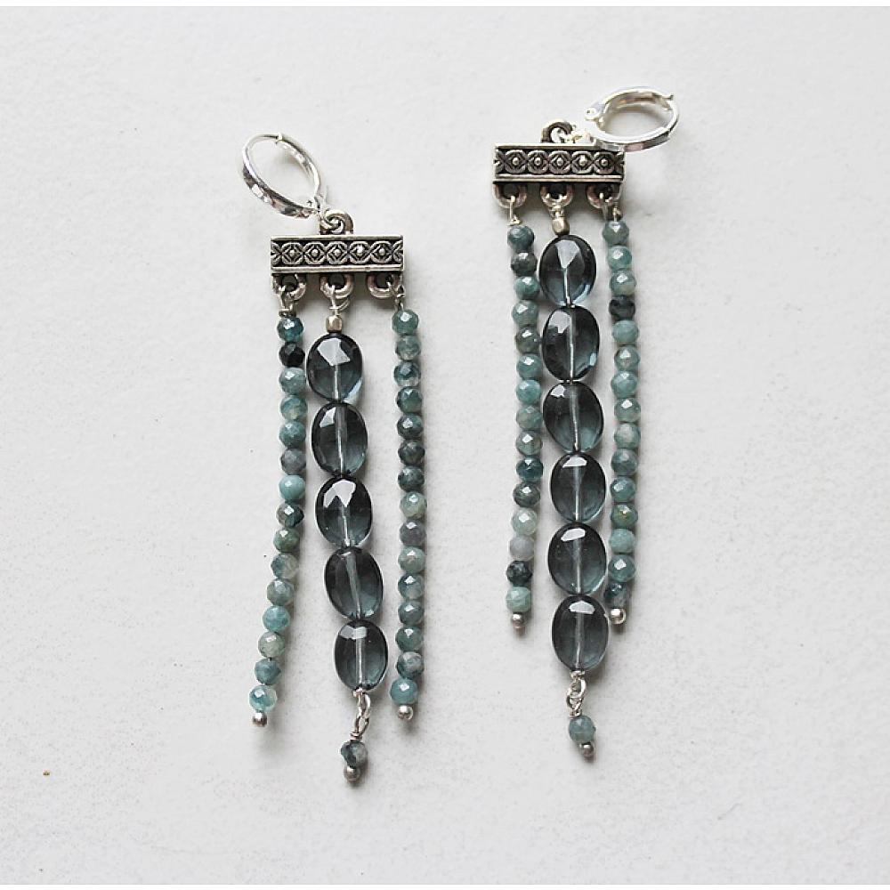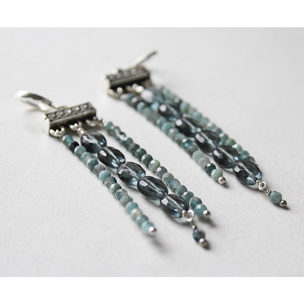 * Can you say, OMG? These beauties pair with the Kitson Bracelet but they are a thing of beauty all by themselves. Chandelier style earrings - 2 rows of Grandidierite beads with a row of Blue Quartz sandwiched between. I've hung them on sterling silver leverback earwires. Truly beautiful and unique.