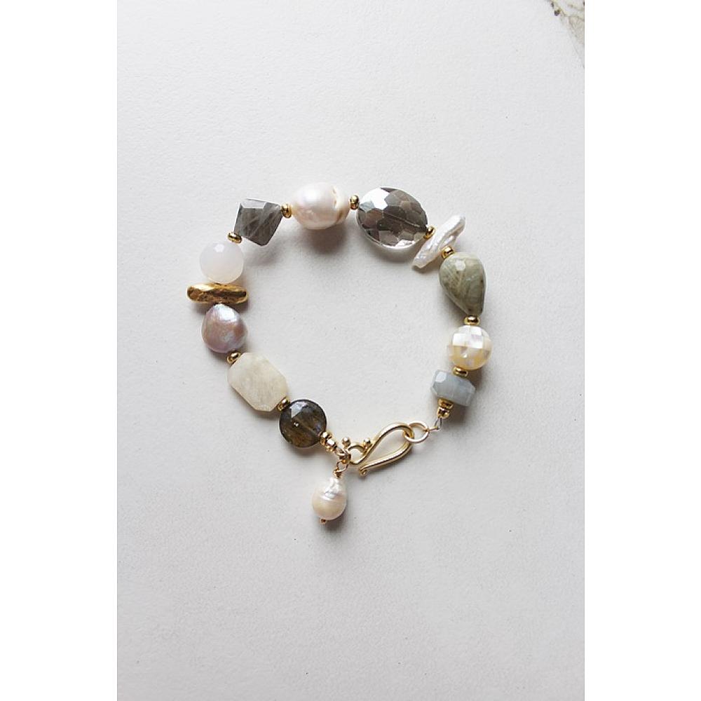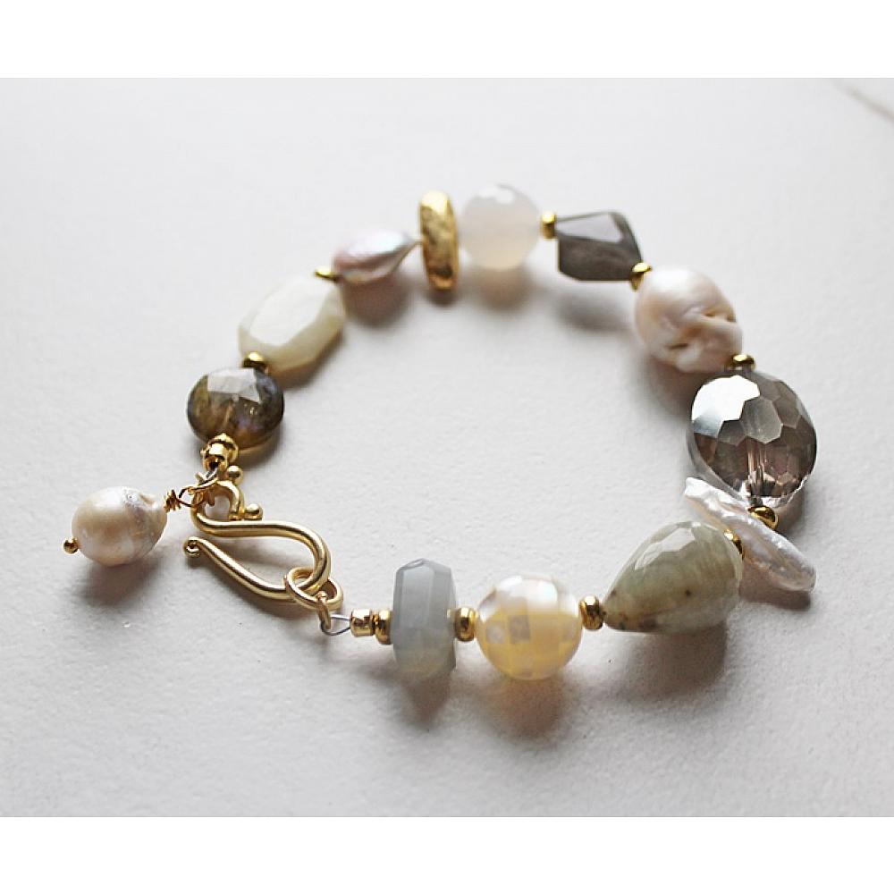 * This bracelet . . . born out of a messy work bench. Literally a handful of gems and glass that were piled on my desk top. Fresh Water pearls, labradorite, aquamarine, moonstone, spacers. Just a gorgeous bracelet that literally goes with everything. I've strung this bracelet on heavy duty wire, added a matte gold clasp, and added a fresh water pearl dangle to finish it off. I made one for myself . . . it's that pretty!